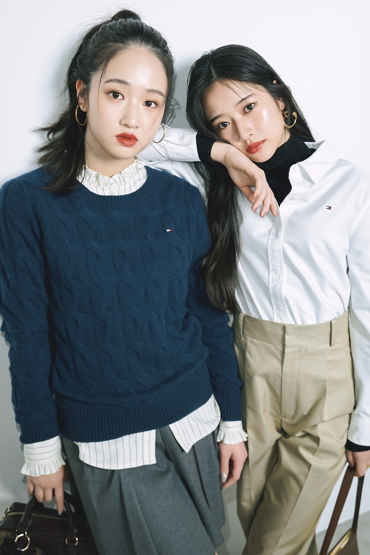 【AI】表情豊かなケーブルニットにフリルシャツを重ねて、きれいめフェミニンなレイヤードスタイルに♡ きちんとおしゃれに見せてくれるトミー ヒルフィガーの服は、藤岡三姉妹も学生時代からリアルに愛用中! ニット¥22,000(トミー ヒルフィガー)、シャツ¥9,990(UNIQLO<コントワー・デ・コトニエ>)、スカート¥18,700(ジャスグリッティー)、バッグ[チャーム付き]¥15,400(ダイアナ 銀座本店<ダイアナ>)、ピアス¥3,520(mimi33/サンポークリエイト)