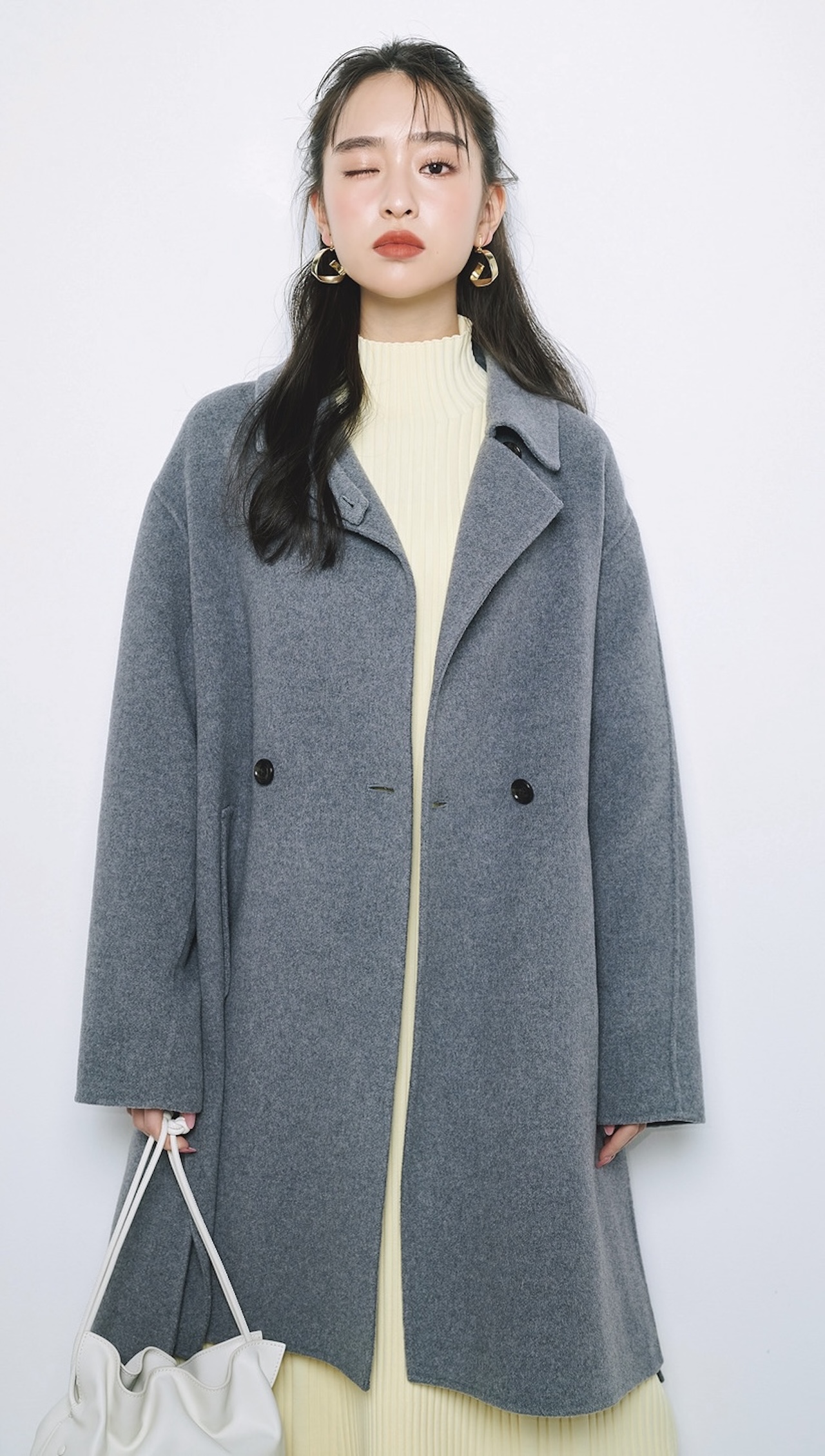 大人ムードなグレーのリバーコートを、イエローワンピでフレッシュに。どの世代にも刺さるスタンダードなセンスのよさで「お母さんと一緒に買い物に行くときによく購入する」という人も多い23区。イタリア・マンテコ社製の上質なウール素材が、袖を通すだけで一歩大人な自分へとブラッシュアップしてくれる♪