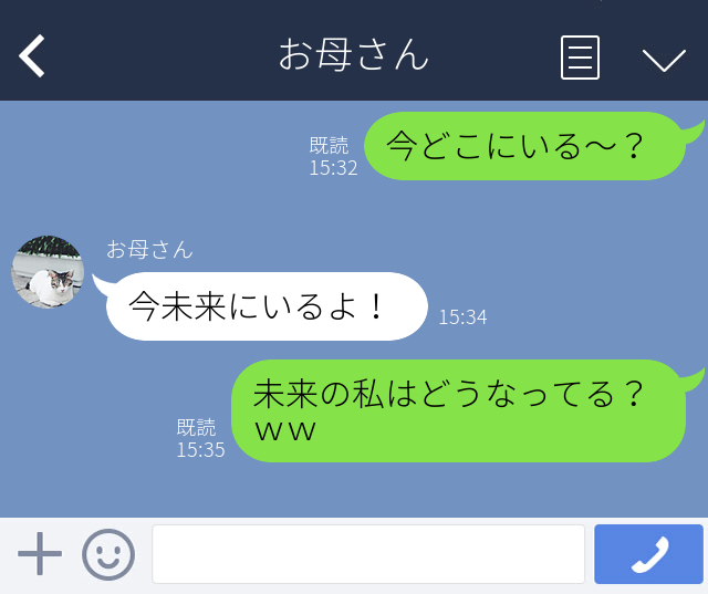 「母に集合場所の話で着いたかなと思って「今どこにいる~?」と聞いたら、「今未来にいるよ!」と返信が…「未来の私はどうなってる?ww」と送りました。後々、聞くと水戸駅にいると伝えたかったようです!」(21歳・会社員)