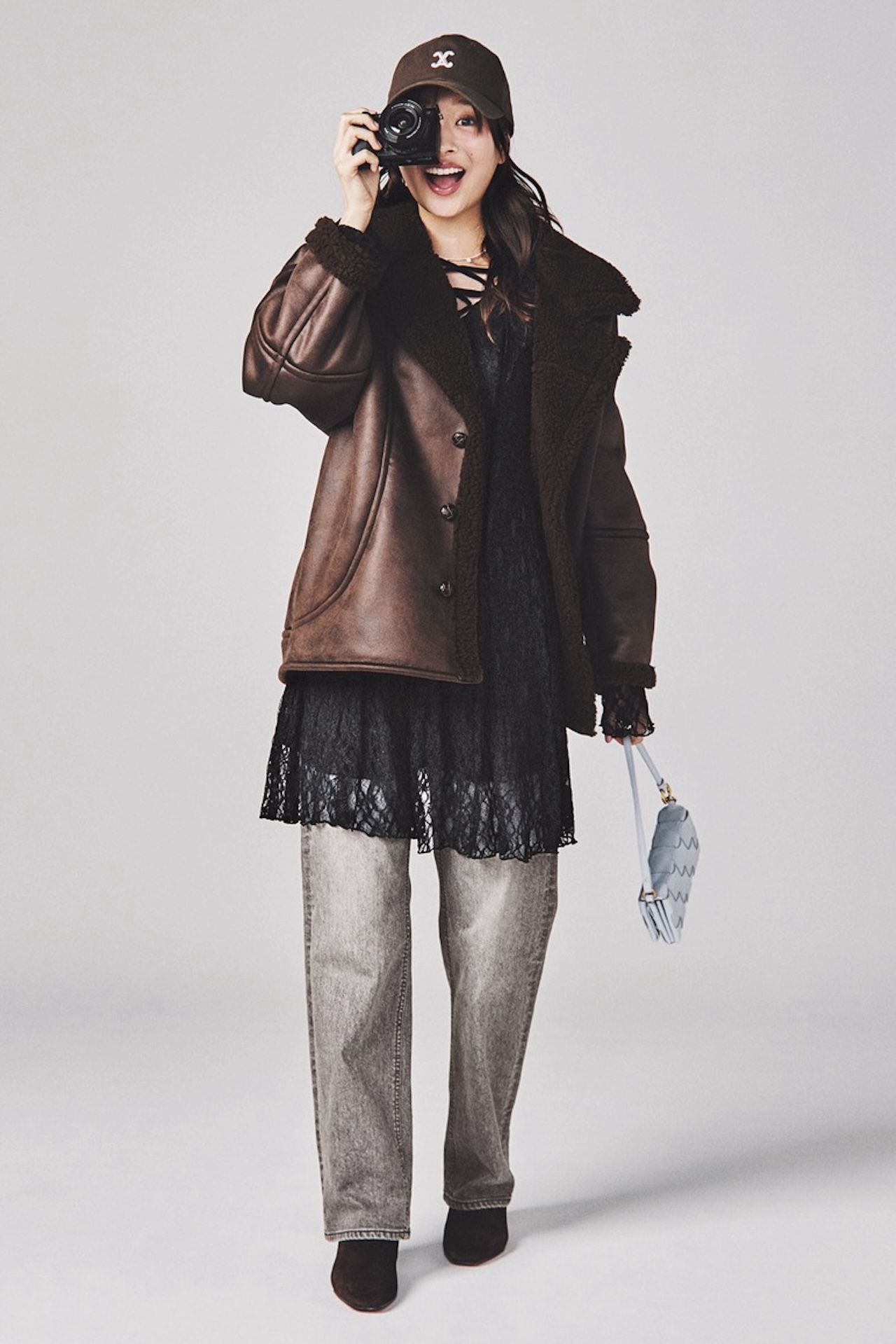 起毛感のあるレースとベロアのストラップが、甘すぎず洒落たミニワンピ。アクティブに動きたい動物園には、ラフなデニムをレイヤードしてカジュアルダウンを。黒レースが持つノーブルな雰囲気と調和するように、グレーデニムやブラウンコートなどシックな色使いでまとめて。