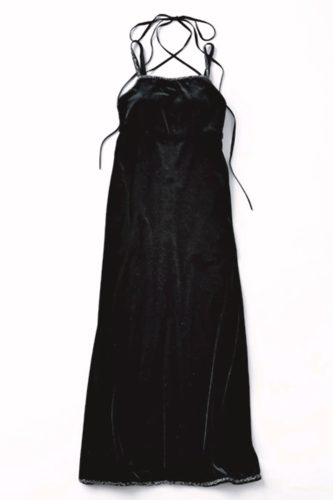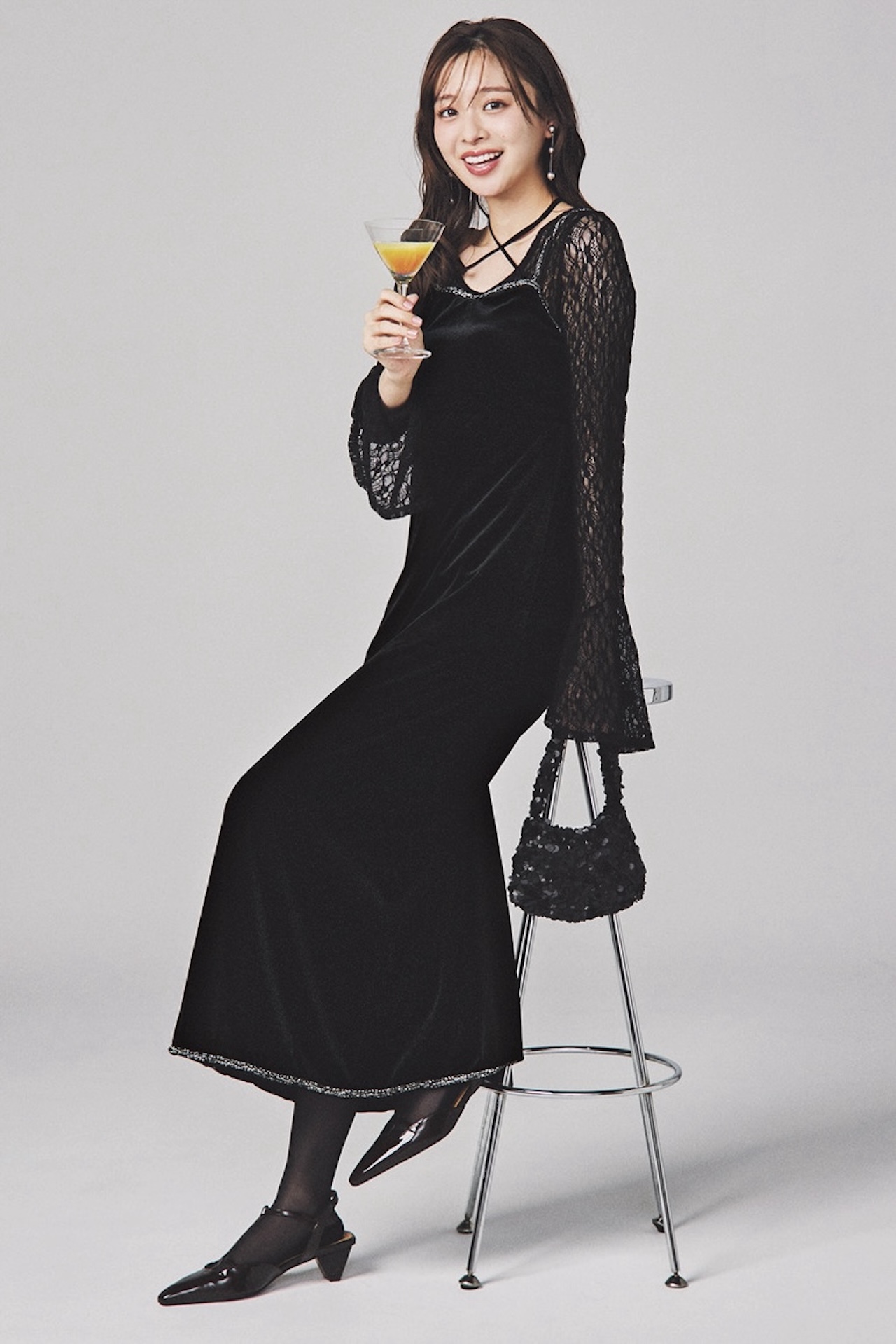 リッチな光沢がドレッシーなベロア素材のキャミワンピ。透け感たっぷりのセクシーなレーストップスにレイヤードすれば、オールブラックもこんなに華やかに、色っぽく着られる♡ 揺れるピアスやキラキラ小ぶりなバッグも女っぷりを高めるのにひと役!