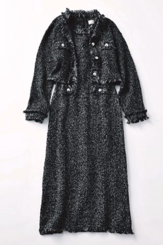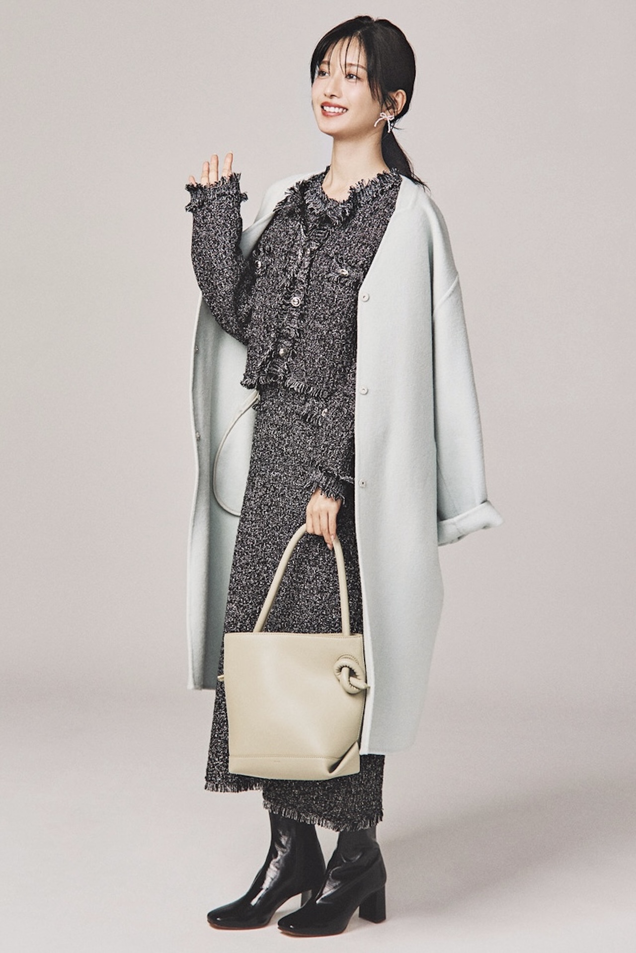 表情のあるミックスツイードやフリンジのあしらいなど、クラシカルな中にも遊び心のきいたデザインが♡ ストンとしたIラインのノースリワンピに、同素材のカーデをはおったきちんと見えするシルエットは、オフィスコーデにも大活躍。ミントコートをはおって爽やかな甘さを上乗せ。