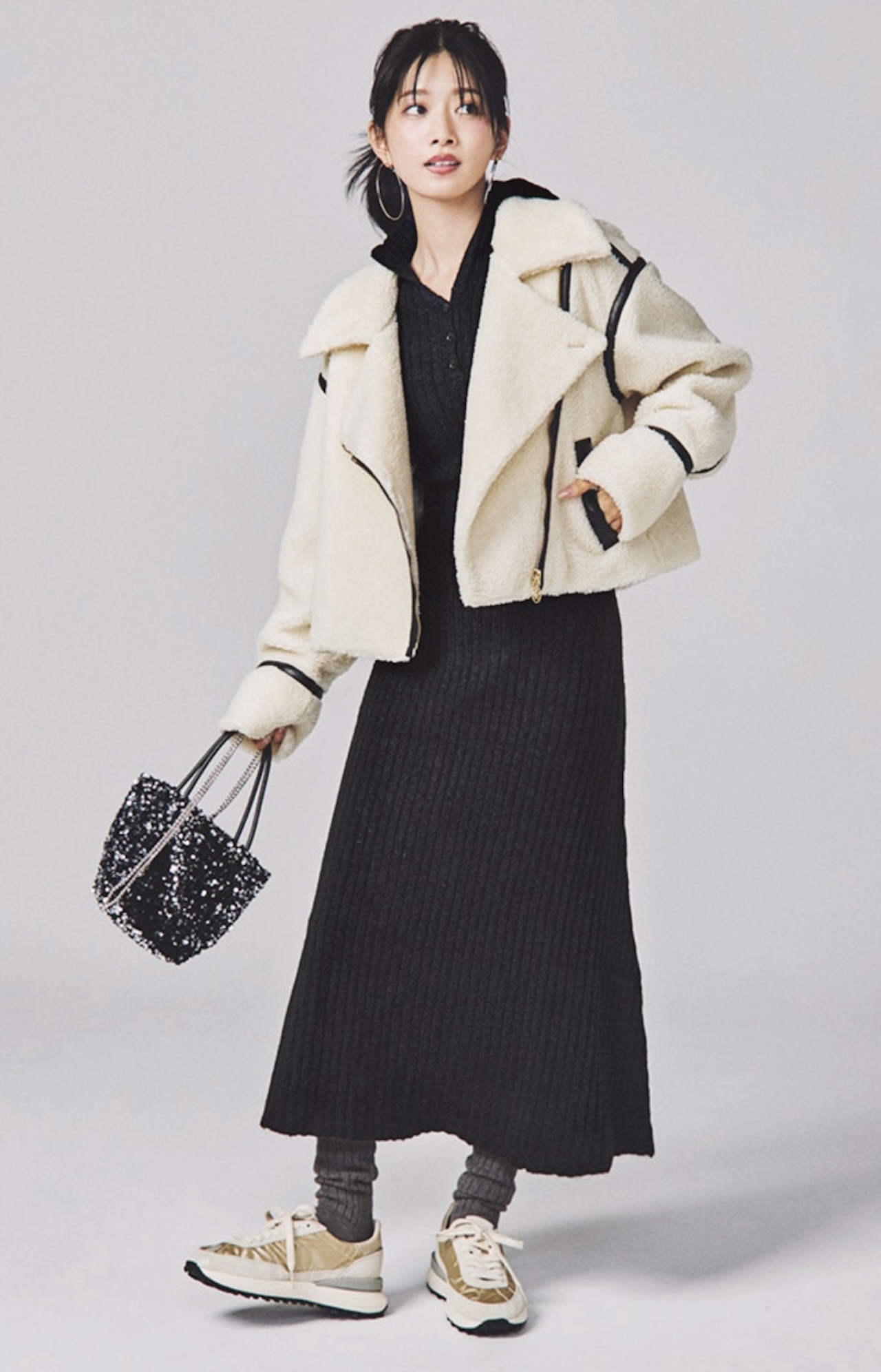 一見無難なフード付きのニットワンピは、ボディラインを美しく見せるこだわりのシルエットや伸縮性に優れたやわらかいリブニット生地で、差がつく洗練された佇まいに。アウターはボリュームたっぷりのボアコートを合わせると、「ゆるピタ」な洒落バランスが即完成! 観戦中はユニフォームを重ねてテンションアップ!