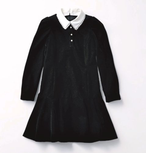 王道のお嬢さまライクな襟付きワンピは、リッチな光沢のベルベット素材や裾がふんわりと広がるレディな美シルエットが着るだけで絵になるかわいさ。