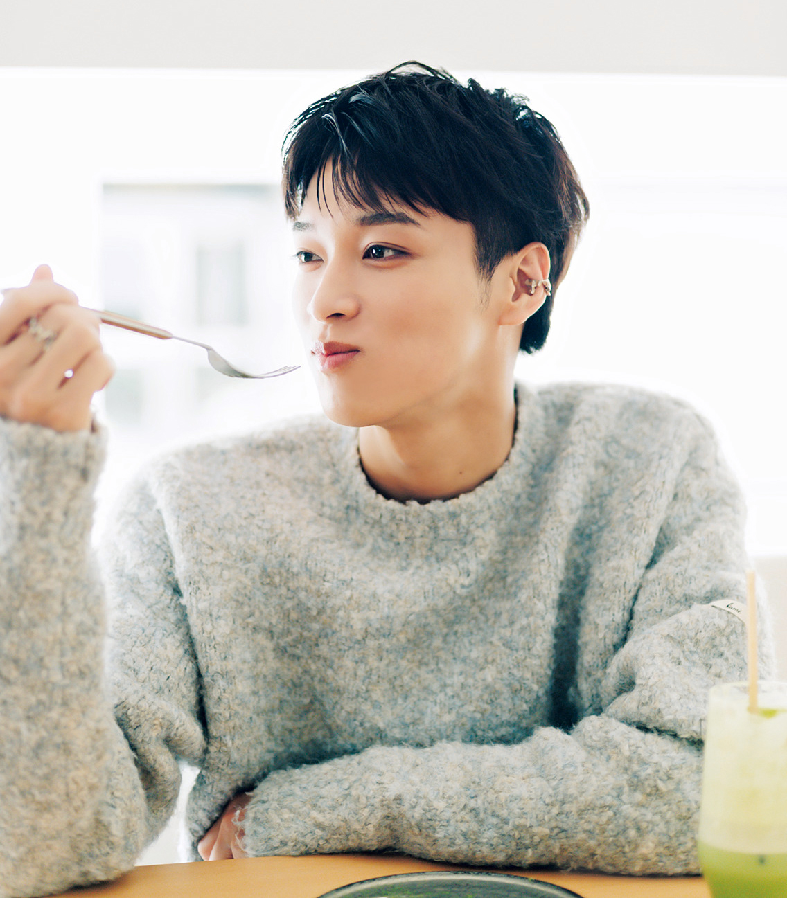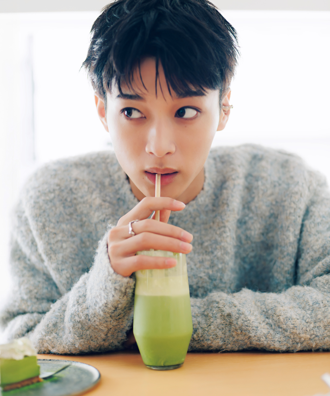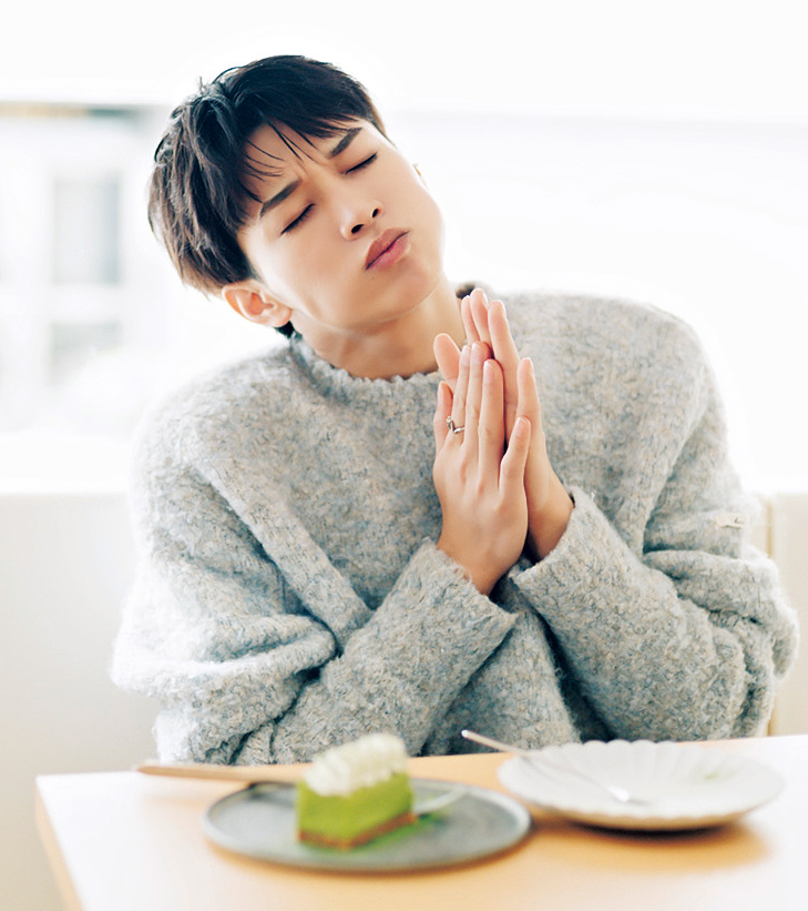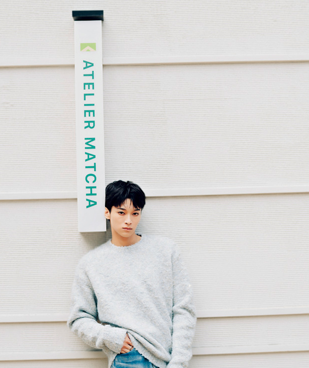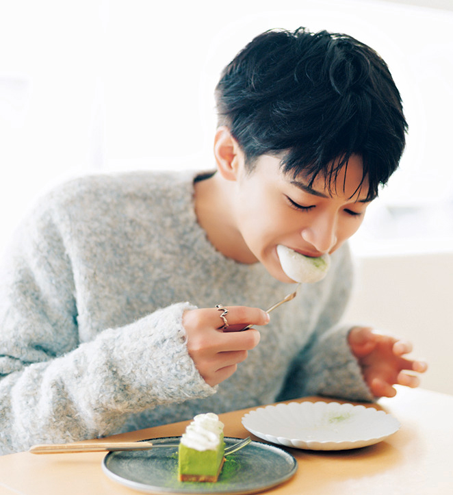抹茶スイーツを食べたのは久しぶり! 上京してから食べる機会が減ったので、久々ですごくうれしかったし、ご褒美になりました。抹茶を好きになったきっかけははっきり覚えていて、幼稚園のときの茶道です。親の迎えを待っている間に先生がたててくれて、周りのみんなが「苦い」と言っている中、僕はその苦味がクセになってすごくハマって! 毎回飲んでいたし、そこから味を選ぶときは抹茶があれば、絶対に抹茶を選ぶように。中学の修学旅行で京都に行ったときもグループのみんなを説得して、抹茶をたてに行ったほど。それくらい大好きなんですけど、今は少し食事制限をしているので控えています。とあるドラマに出演したときに俳優の先輩がグルテンフリーとカフェインレスの食事をしていて、話を聞いたらすごくよさそうで、僕もここ半年は意識して食事をしているんです。本当はラーメンも大好きなんですけど、もう全然食べていません。でも自分磨きが好きだから、こういうのはまったく苦にならないタイプ。むしろ、何かひとつ頑張れているということが自信にもつながるので、僕には合っているのかも。とはいえ、作品中やお仕事での食事や差し入れは気にせず食べますけどね。マイペースに、無理なく続けています。