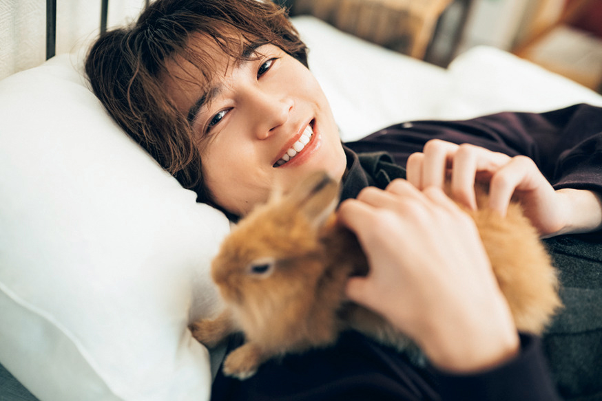 スタッフ一同が驚いた、超小顔&高身長で奇跡のスタイルの庄司さん。うさぎとの撮影は初めてで「カワイイ〜♡」とテンション↑。うさぎもイケメン好きなのか、すっかり懐いていました♪