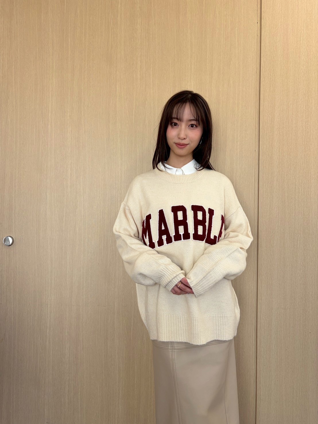 カレッジ風ロゴをあしらったトレンドニットが存在感たっぷり! 一点でキャッチーに仕上がるので、その他のアイテムはきれいめに統一。オフホワイト×ベージュのニュアンス配色も手伝って、大人の遊び心を感じるコーデに。