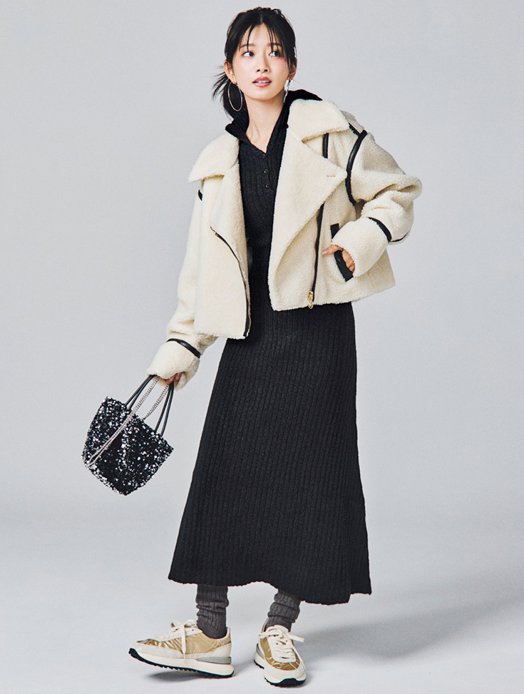 スポーツ観戦に行くなら、ユニフォーム映えする黒ワンピで! 程よくタイトなニット素材なら、スタイルアップしつつ遠征でも楽ちん。アウターはボリュームたっぷりのボアコートを合わせると、「ゆるピタ」な洒落バランスが叶います。