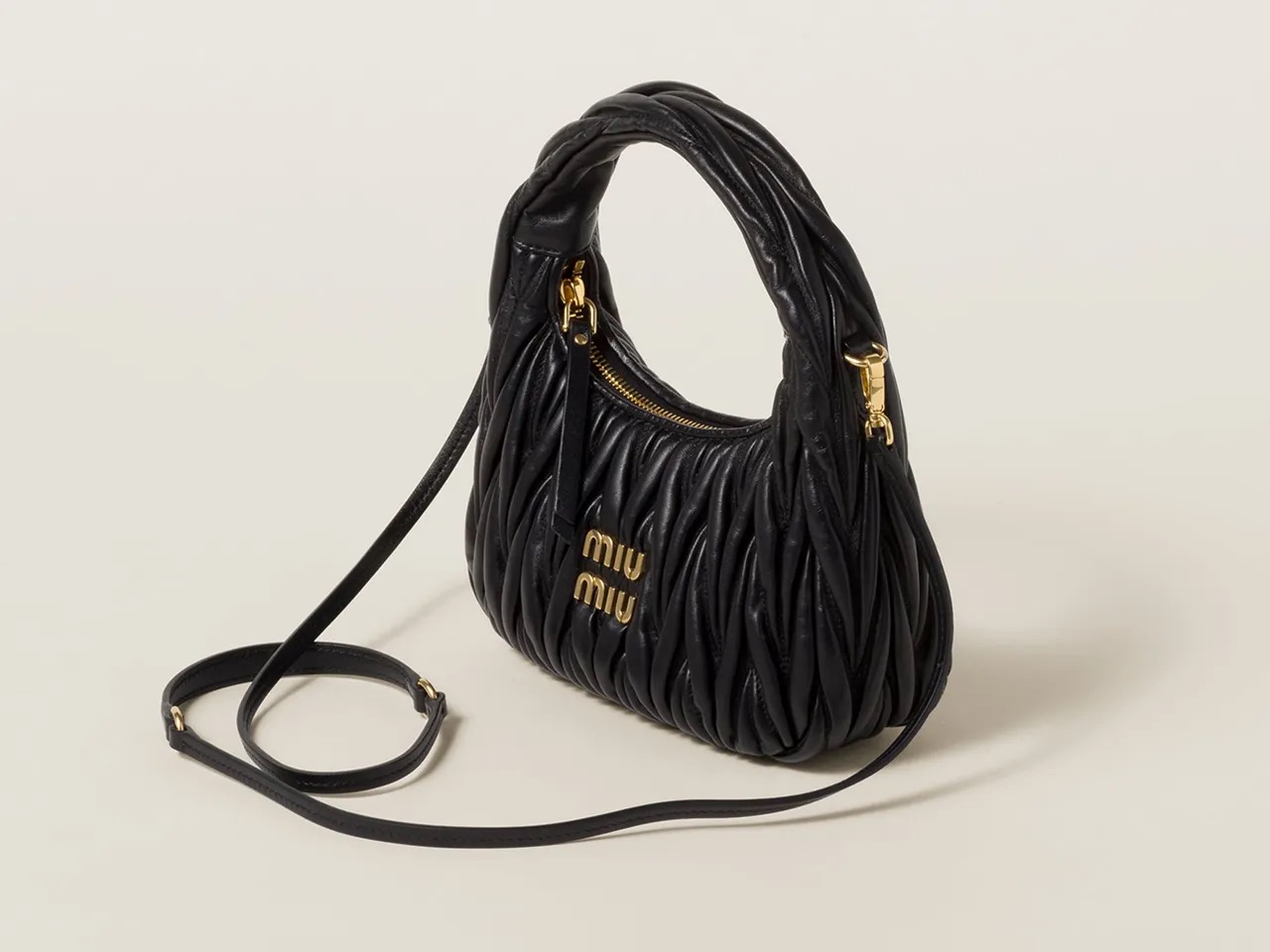 エンボス加工のMIU MIU ロゴやゴールドのパーツが際立つミニマルなデザイン。シンプルだからこそカジュアルからフォーマルまで、あらゆるテイストの着こなしに合わせて楽しめます。人気のチャームが映える、控えめなデザインがちょうどいい!