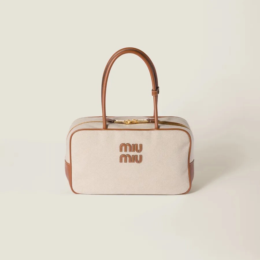 軽やかなキャンバスはニュートラルな色合いでコーデのしやすさも抜群! レザーのトリムとブランドロゴが効いていて、ひと目でMIU MIUだとわかるアイコニックな仕上がりに。
