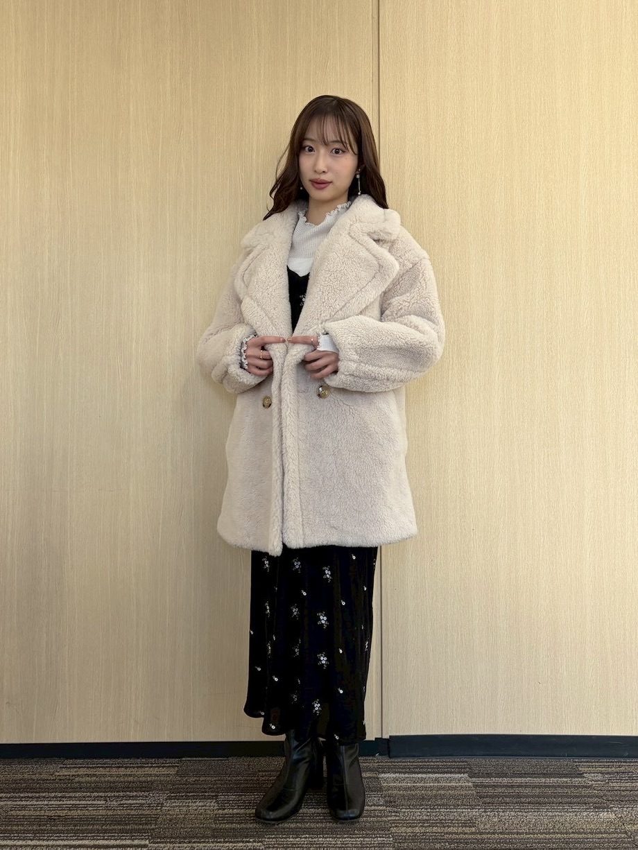 小花柄とドットの刺しゅうをあしらった着映えワンピ。ベロア素材も手伝って、上品華やかな印象に。冷え込む今日はボリューミーなもこもこのボアコートを羽織っておしゃれに寒さ対策も!