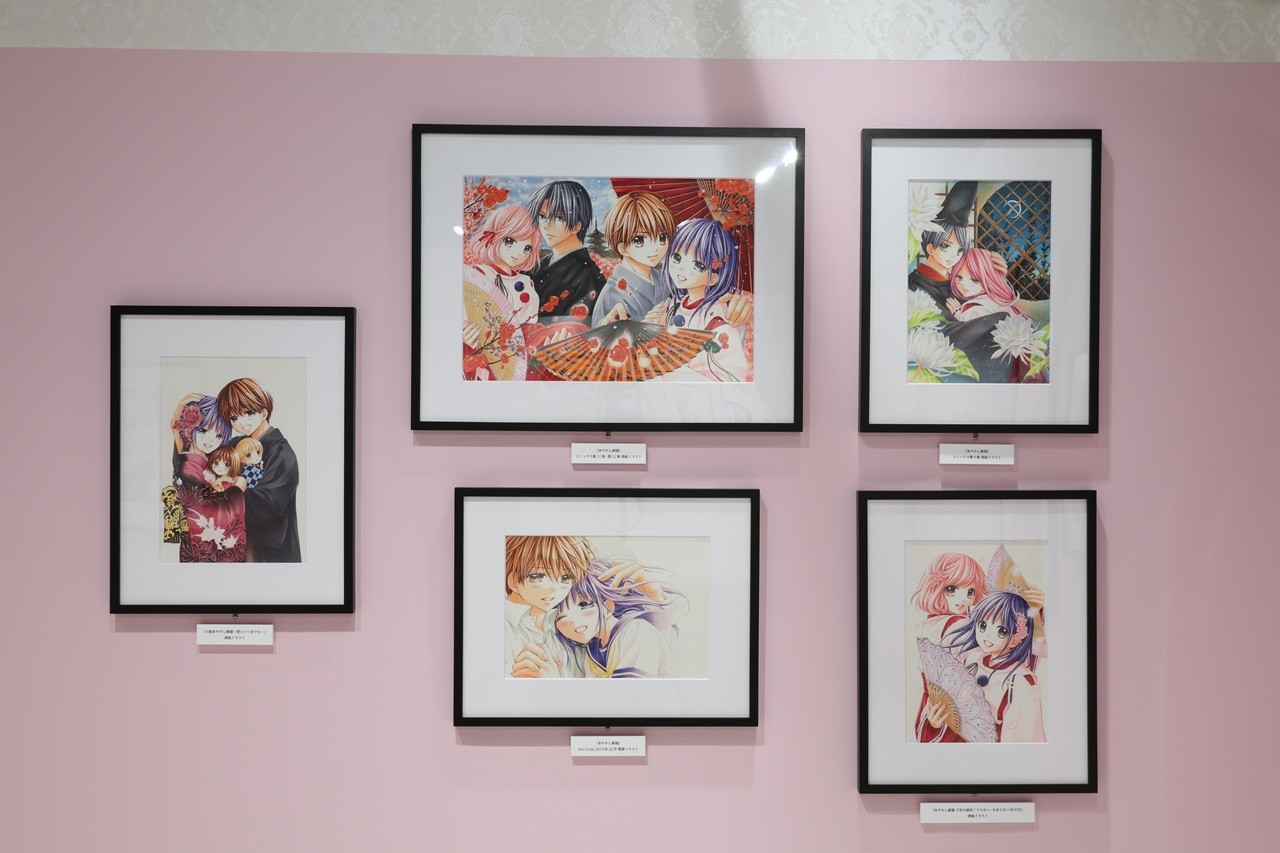 会場に入ると、まず目に飛び込んでくるのは、おふたりのデビューからこれまでをまとめた年表と、歴代の『Sho-Comi』付録たち。ノートやクリアファイル、シャープペンシルなど美麗なイラストが印刷された定番アイテムから、パスケースやブーブークッション(!)まで盛りだくさん。「この付録、持ってた~!」と振り返りながら眺めるのも楽しそう♪