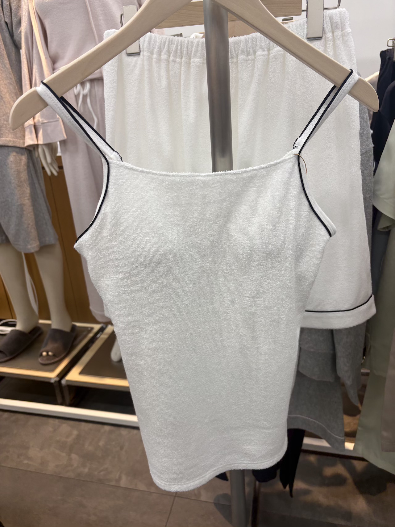 まるでタオルに包まれているかのような…♡ 着心地抜群の両面パイル仕様のキャミソール。こちらはリラックスウェア寄りのキャミソールです。こちらも細めのブラックでふちどりされているのがとてもかわいい。締め付けが全然ないので、リラックスしたいお家デーにおすすめ。