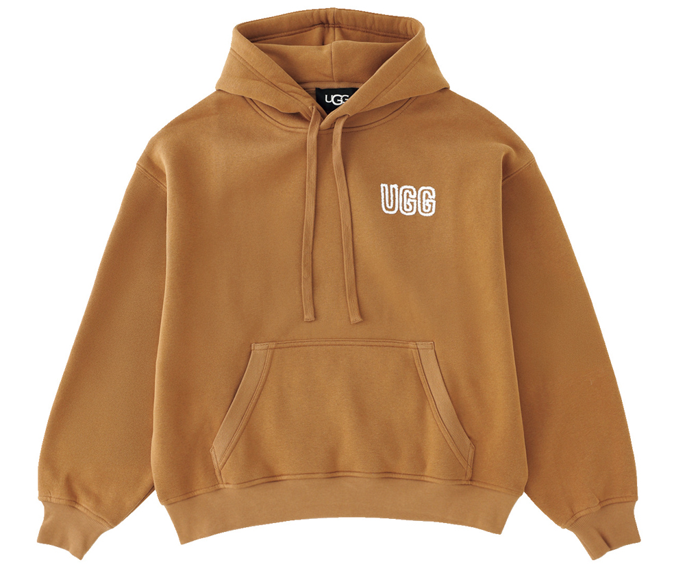 トレンドのブラウンに、ホワイトのブランドロゴが効いた「UGG ロゴフーディ」(Mサイズ/¥17,600)は、やわらかなスエット生地で着ごこち最高♡ 定番にデニムに合わせるもよし、春先はミニ丈にダボッと合わせてこなれたカジュアルコーデを楽しんで。