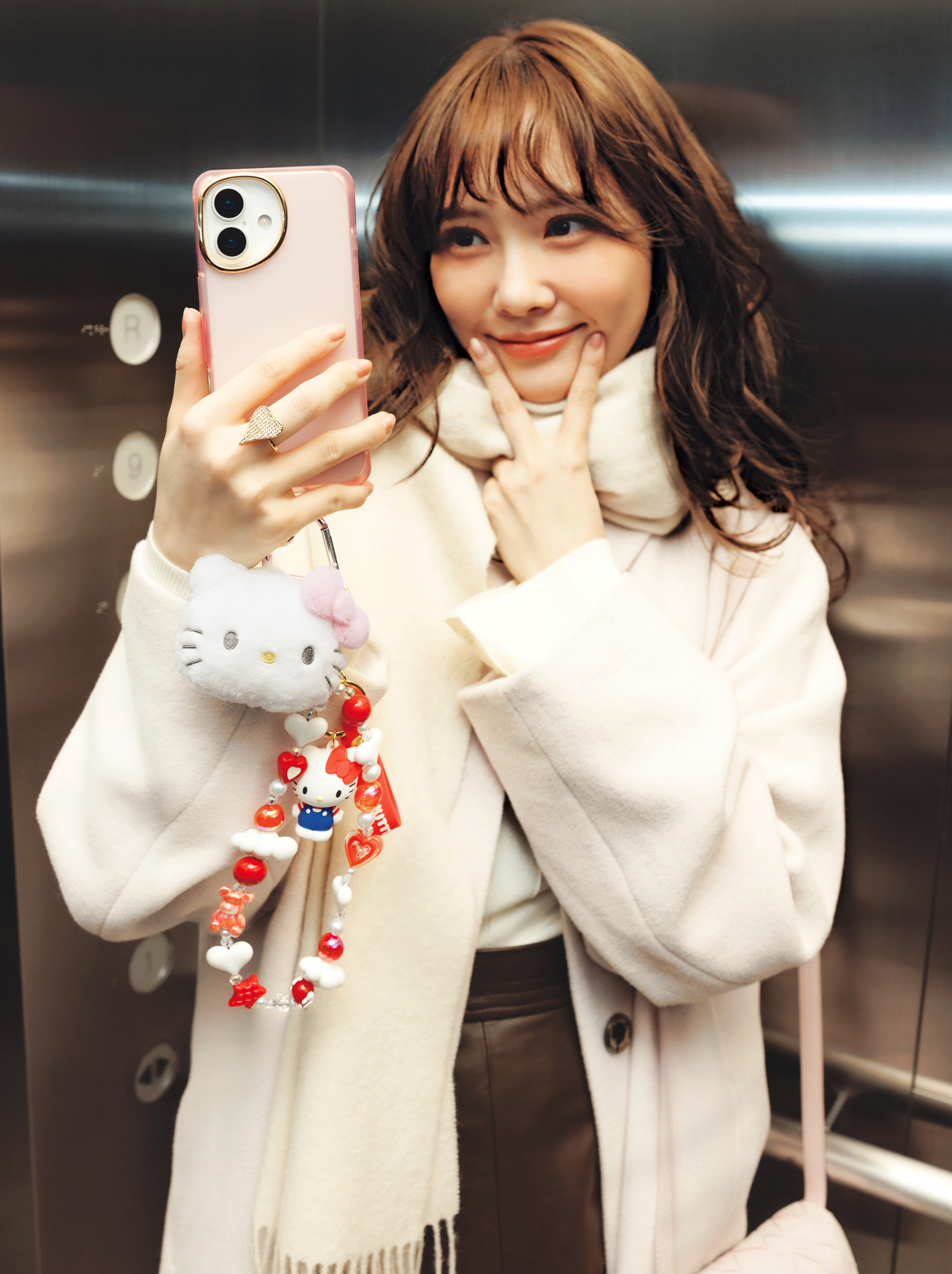 フェイス形マスコットホルダー¥990・立体キーホルダー¥990(サンリオ)©’25 SANRIO 著作(株)サンリオ、ビーズストラップ¥3,200(Beees Beees)、iPhoneケース¥2,750(Hamee<salisty>)、コート¥143,000(フィルム<Sov.>)、ニット¥19,800(オンワード樫山<アンクレイヴ>)、スカート¥41,800(ánuans)、ストール¥15,950(セムインターナショナル<TWEEDMILL>)、バッグ¥15,900(CHARLES & KEITH)、リング¥6,380(burself)