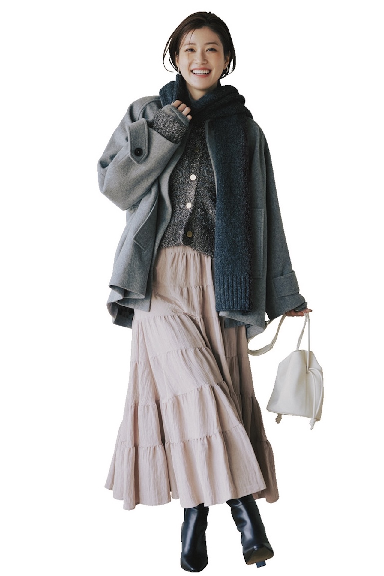 ピンクと好相性なグレーを上半身に重ねることで、つやっぽティアードスカートを大人に攻略できる。