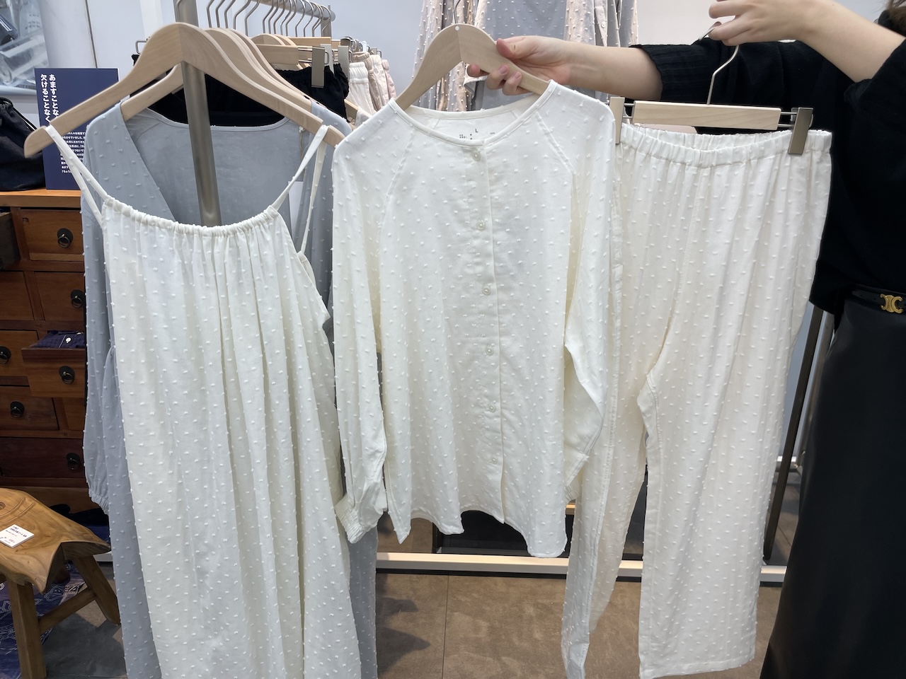ぽこっとしたドット柄の織り方がかわいいこちらのルームウェア。無印良品ではこれまでもガーゼのパジャマは販売されていたものの、シンプルなデザインが多めでした。でも今回は、ドット柄のガーゼが初めて販売され、20代女子もつい着たくなるかわいらしいデザインがたくさん!