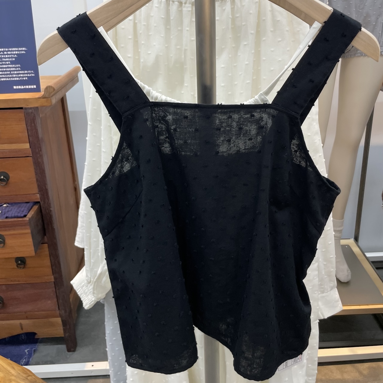 タンクトップは短めの丈でぽわっと外に広がるシルエット。体のラインを拾わない軽やかで立体的な形が、かわいらしさと上品さを兼ね備えています。背中はゴム使用かつ、直接肌に当たらないよう布で包んでいる仕上がり。背中部分は伸びるので動きやすく、快適です! マネキンのようにインナーとして着てもよし、暑い日には1枚で着てもgoog!