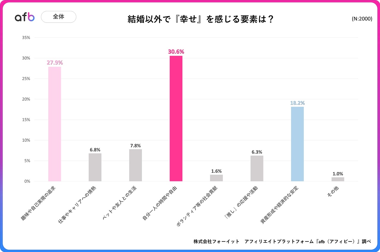 結婚以外で幸せを感じることを質問したところ、最も多かったのは「自分一人の時間や自由」(30.6%)、僅差で「趣味や自己実現の追求」(27.9%)が続きました。自分が本当にやりたいことができる環境や、興味のあることに夢中になれる時間こそが、心を満たしてくれると感じている人が多い様子。