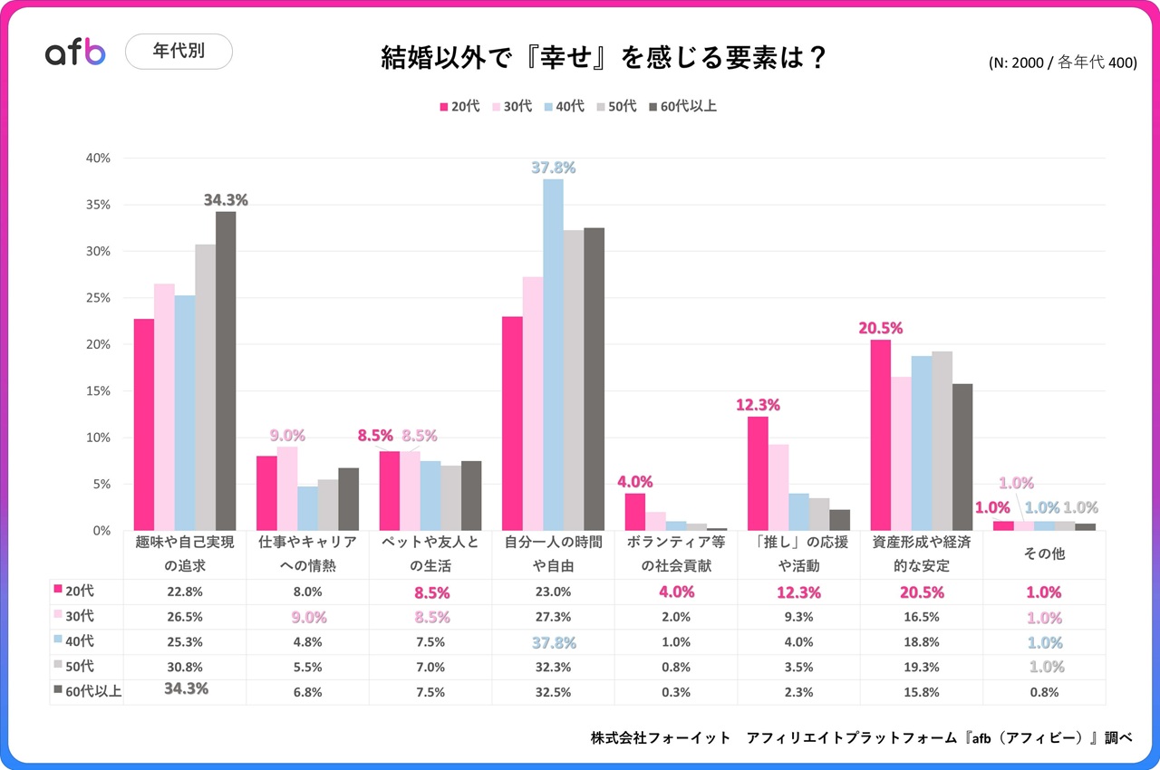 そこで今回は、アフィリエイトプラットフォーム「afb」の開発・運用を行う株式会社フォーイットが、20〜60代の男女2,000人を対象に実施したアンケートをもとに、結婚以外で人が幸せを感じる瞬間と、世代・性別・生活環境別の傾向をご紹介します。