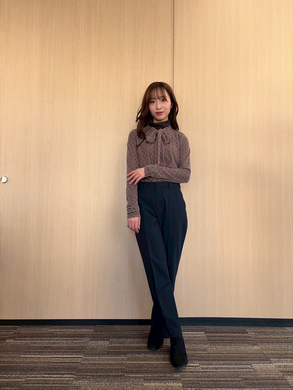 顔まわりがパッと華やぐ、ボウタイ付きのドット柄トップス。ベージュ〜ブラウンの落ち着いたグラデ配色で着こなすと、大人かわいい程よい甘さに着地。お仕事ならきれいめパンツ合わせできちんと顔に。