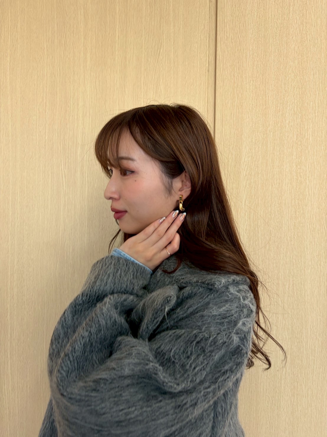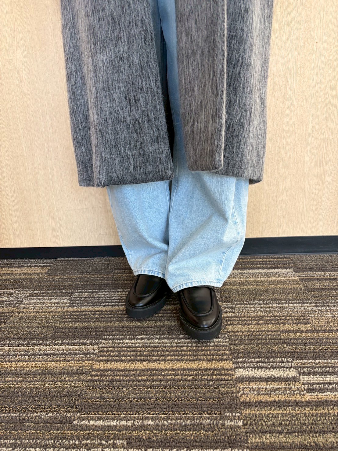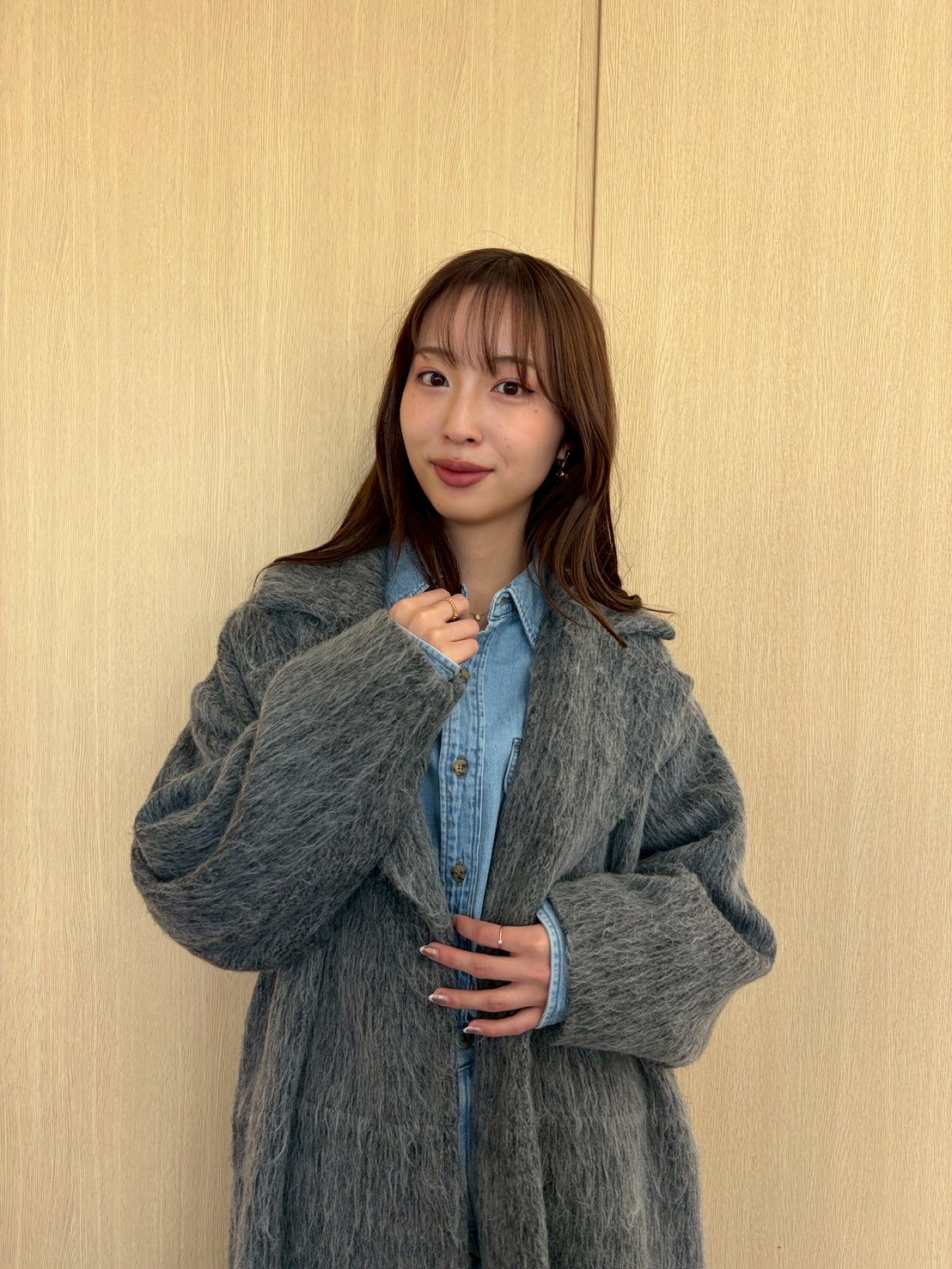 グレーのシャギーコートと、クラシカルなローファーで引き締めて、洗練されたコーデの完成です♡