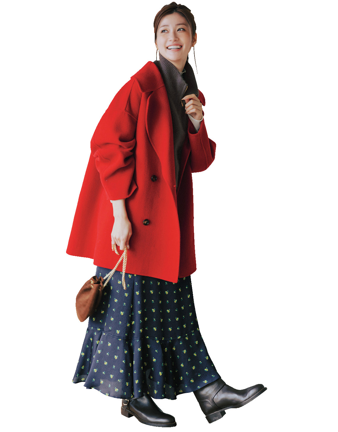 存在感たっぷりな赤コートは、ネイビーベースの小花柄スカートなど、ヴィンテージムードが漂うアイテムと合わせつつ、肩の力を抜いてはおるのが◎。ジップニットやローヒールブーツでラフさを上乗せして、華やかなコートスタイルを攻略!