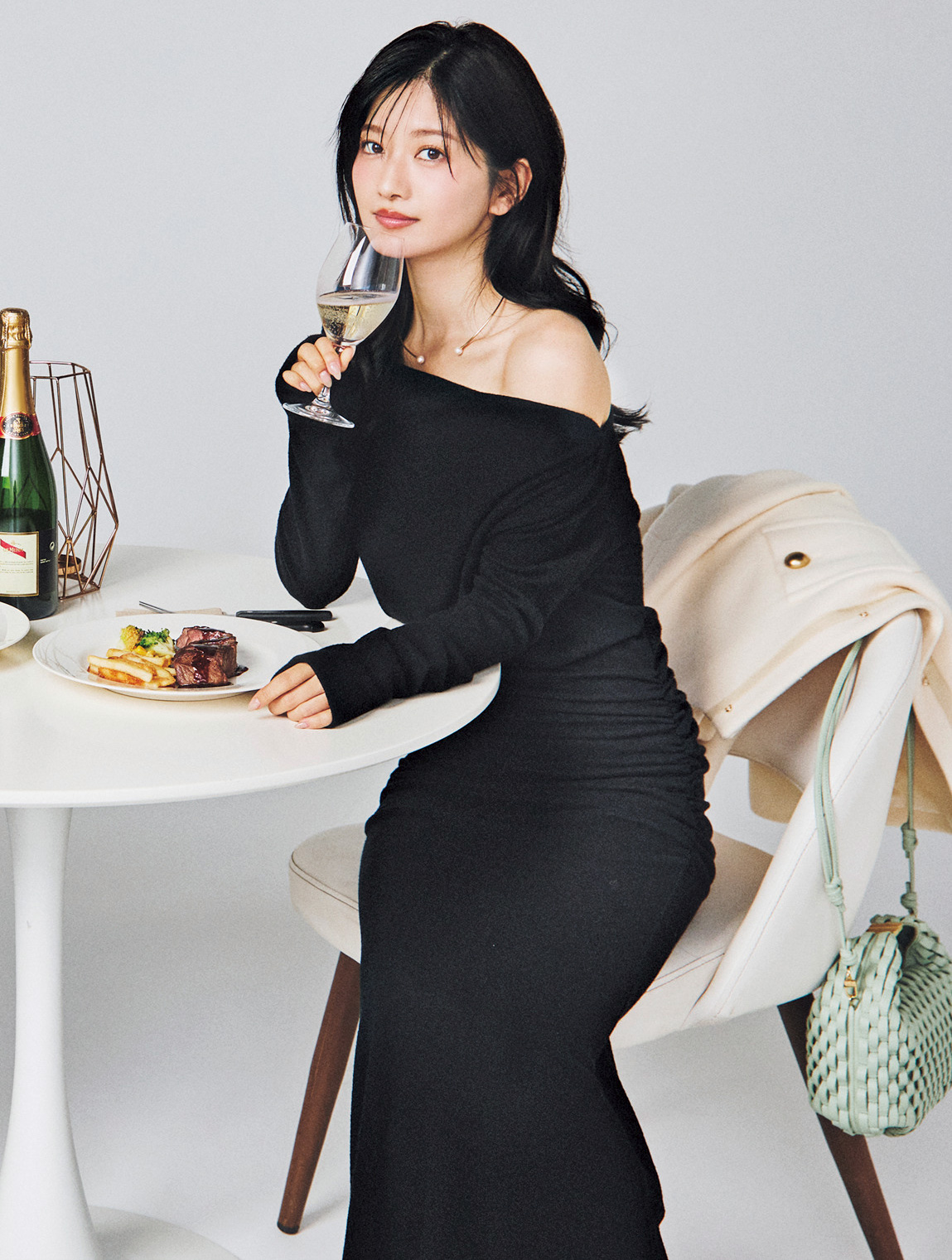 肩を落として着る抜け感のあるシルエットで、グッと洗練度がUP。シルエットにメリハリをつけるシャーリングや体のラインに沿うニット素材は、着るだけで美スタイルをメイク。締め付け感がなく、見た目以上にリラクシーな着心地なのも、ディナーデートにうってつけ。