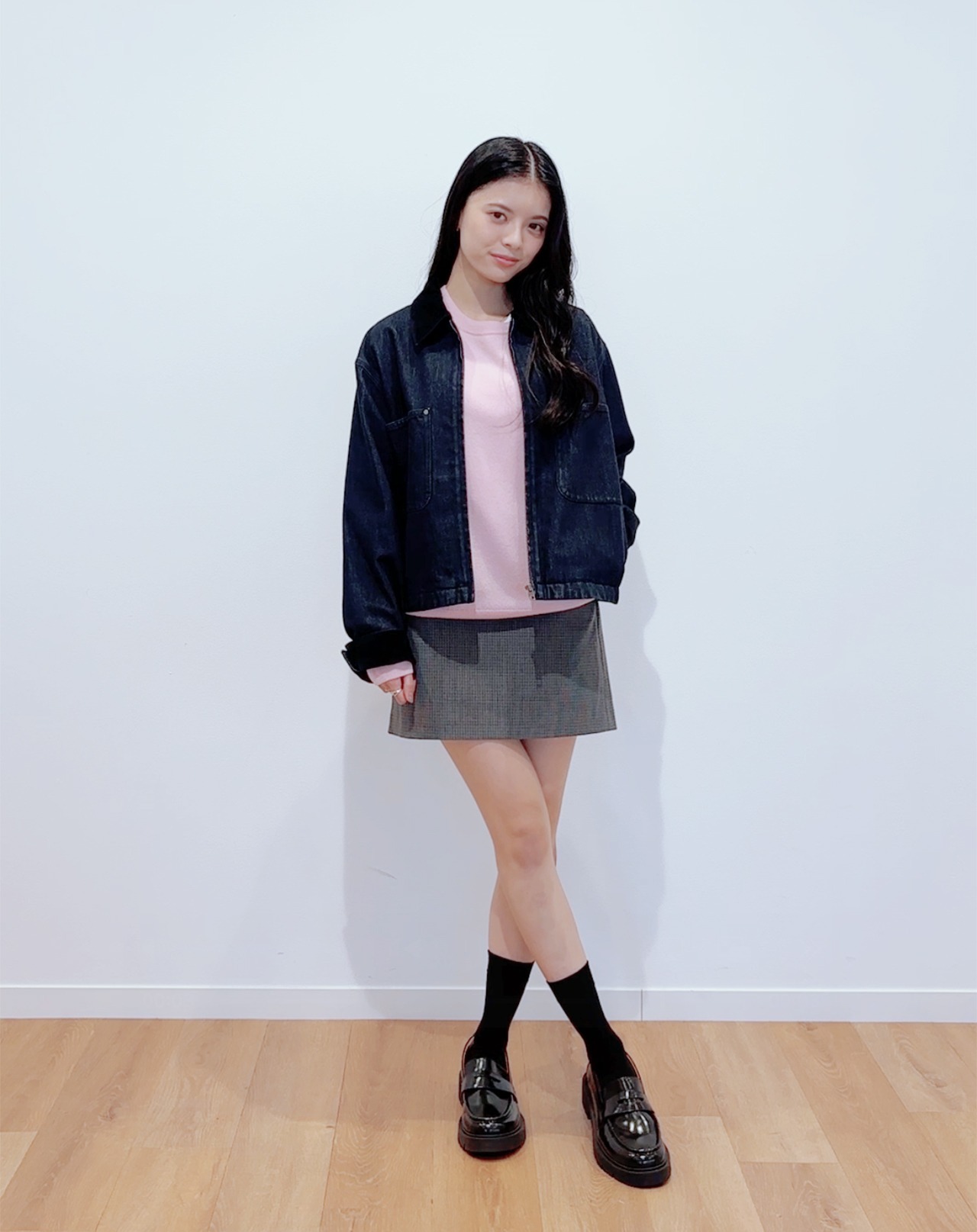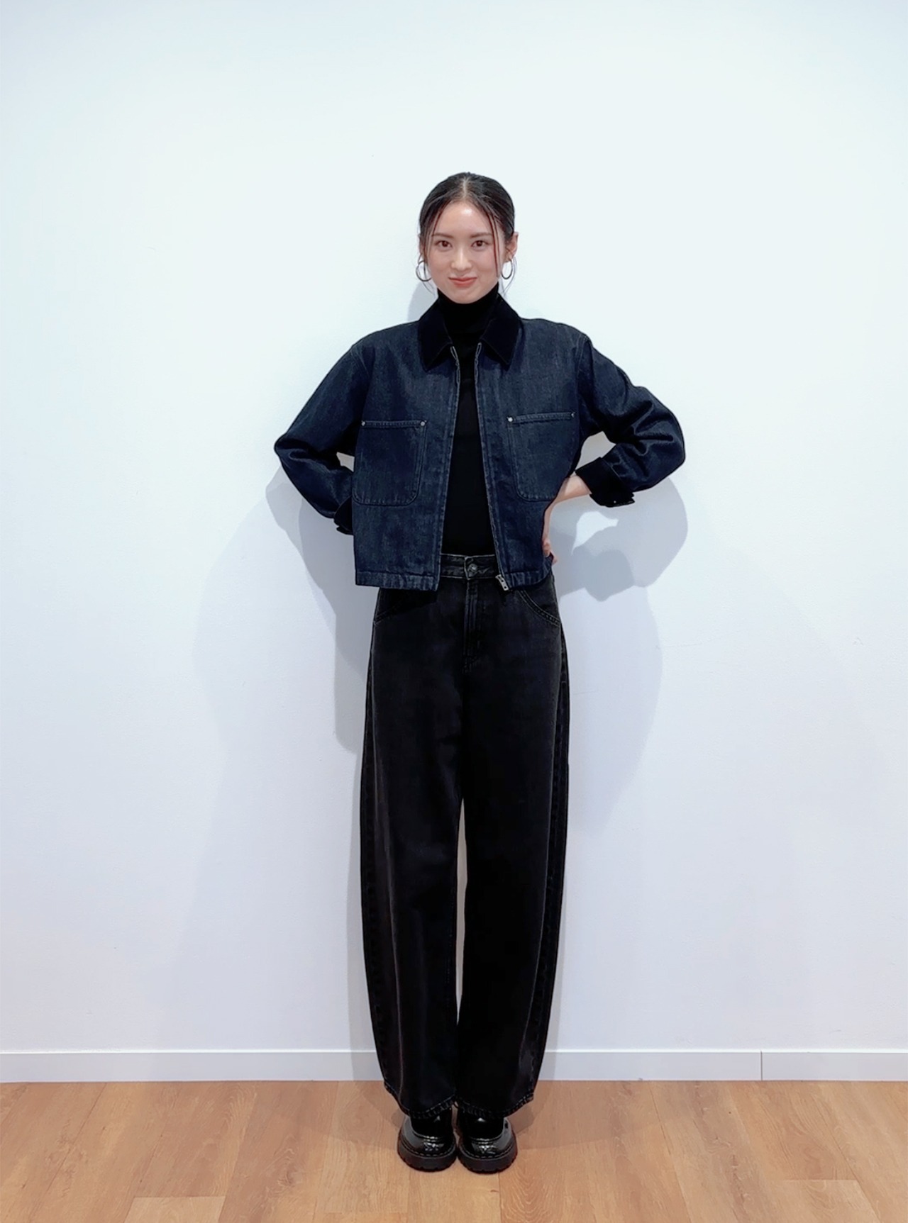 ブルー×ブラックのデニムonデニムも、襟と袖からのぞくコーデュロイがアクセントになって洒落ムードたっぷり。173cmの廣川さんが着るとウエストあたりのジャスト丈で、バギーデニムのシュッとした脚長効果がさらにUP!