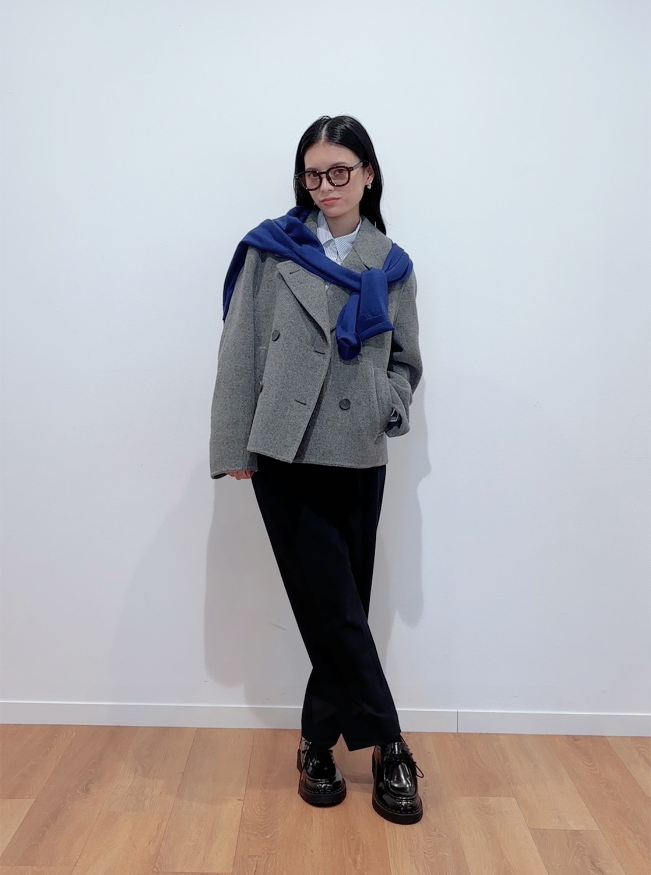 シャツをINしてきちんと感はキープしつつ、グレーのPコートでこなれたムードをアシスト! 女のコらしい大きめの襟&短丈のコートが視線を上に引き上げてくれるから、パンツスタイルもバランスよく着こなせます。