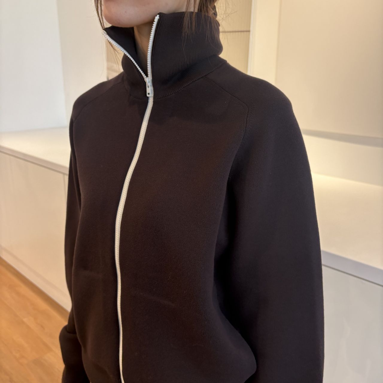 今回のコレクションの中で、ダントツ推したいアイテムがこちらのカーディガン。スポーツブランドのトラックジャケット風デザインと、肌触りのいいきれいめなニットカーデのいいとこ取りで、襟の高さ、ミラノリブのなめらかな素材感、白のジップと、言うことナシの完成度。これ一枚羽織るだけで、なんてことないワンツーコーデも洗練された印象に見えるので、冬も春も絶対にヘビロテします!と声を大にして伝えておきます。