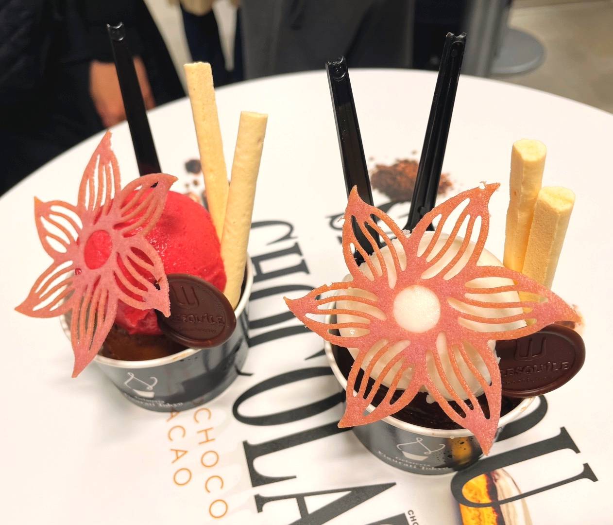 一緒に行った田辺さんはパート1に来るのが2回目とは思えないほど、大量購入していました。さすが、スイーツ女王! 最後にイートインスペースで、プレスキル ショコラトリーの『カカオエディション』というジェラートもいただき、大満足のサロショパート1を過ごせました。“スッキリした味”と“濃厚な味”の2種のジェラートが楽しめてとてもおいしかった~!
