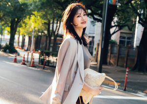 パンツ¥26,400(カデュネ)、ジャケット¥29,700(マイストラーダ)、ブラウス ¥8,690(dazzlin)、バッグ¥88,000(ボナベンチュラ)、スカーフ¥4,510(HANA SHOWROOM <LECYTO>)、靴¥17,600(ダイアナ 銀座本店<ダイアナ>)、イヤリング¥17,600・リング¥17,600(フーブス<IRIS47>)