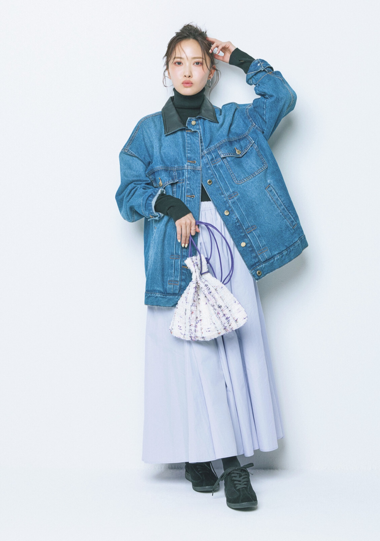 ◾️上品なラベンダーにオーバーサイズのデニムジャケットで親近感をプラス