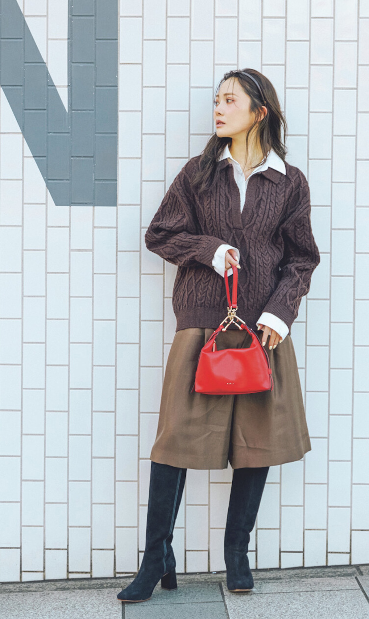 襟付きニット×ショーパンのボーイッシュなコーデに、紅一点の威力で愛らしさを加えて。赤の開運パワーを効果的にきかせるために、服はワントーンでまとめるといい感じ♪