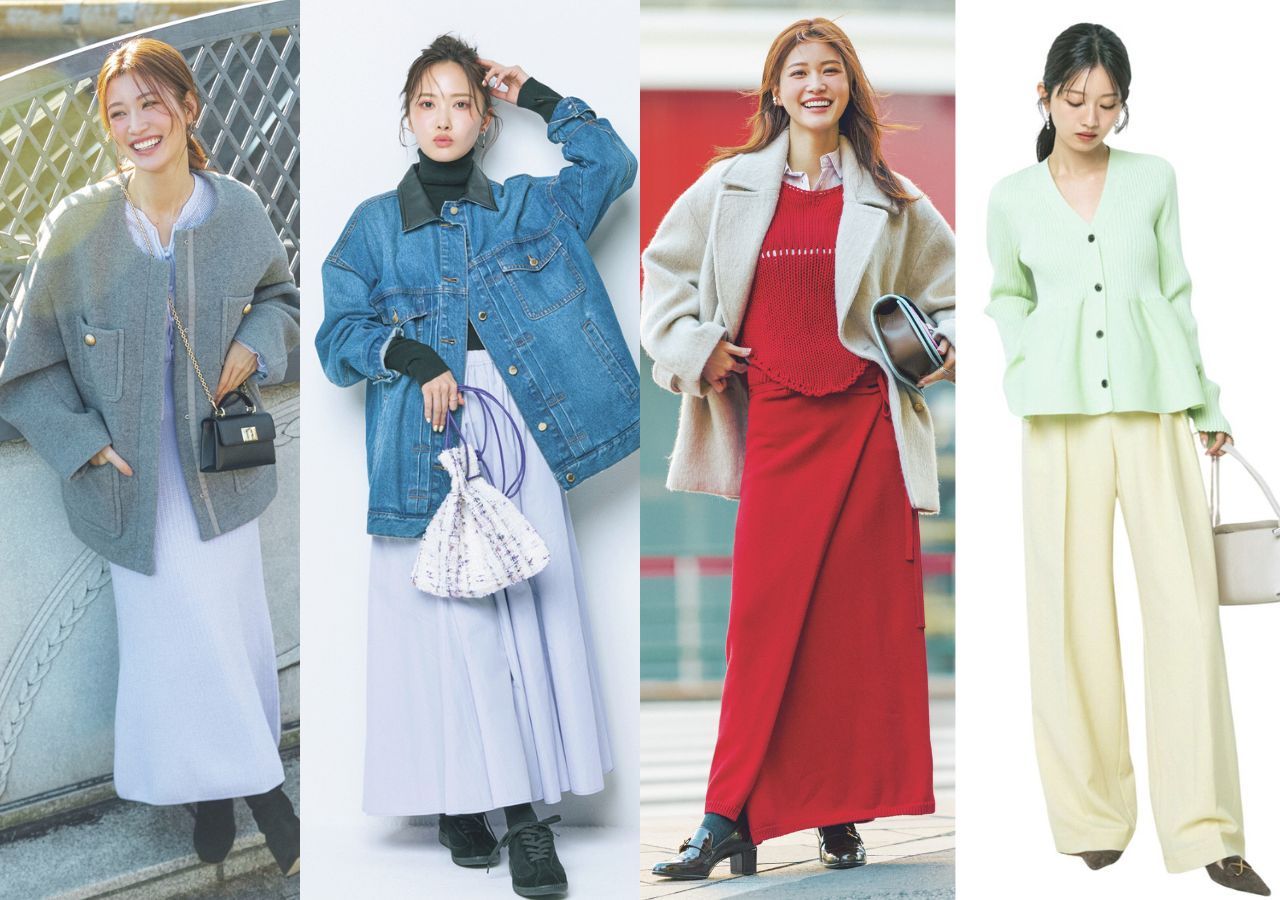 上質なカシミヤのニットにカーデをさらりと巻いて、開運カラーでコーデに洒落た立体感を作成♪ 落ち着いたグレーでなじませて、洗練感のあるスタイルに。恋愛運的には、ボディラインを強調するのも大切なポイント♡