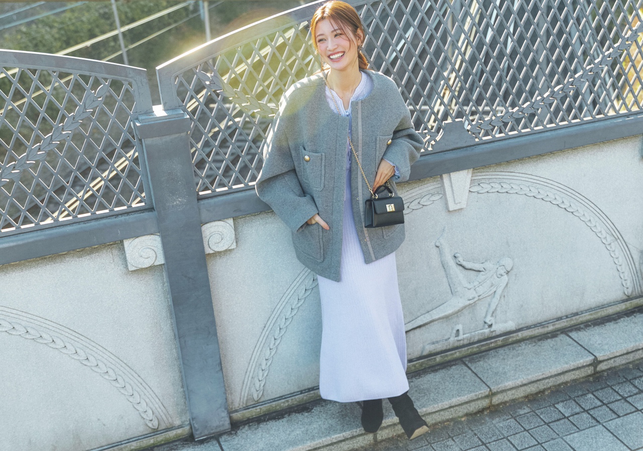 優しい気品が漂うパープルのニットワンピに、グレーのノーカラーコートでスタイリッシュな魅力を上乗せ♪ 「真逆のものと組み合わせるのも開運行動。グレーの持つ都会的・洗練などの印象と、華やかで個性のあるパープルは相性抜群です!」(byここさん) 黒小物で引き締めて、品のいいトーンにメリハリをプラス。