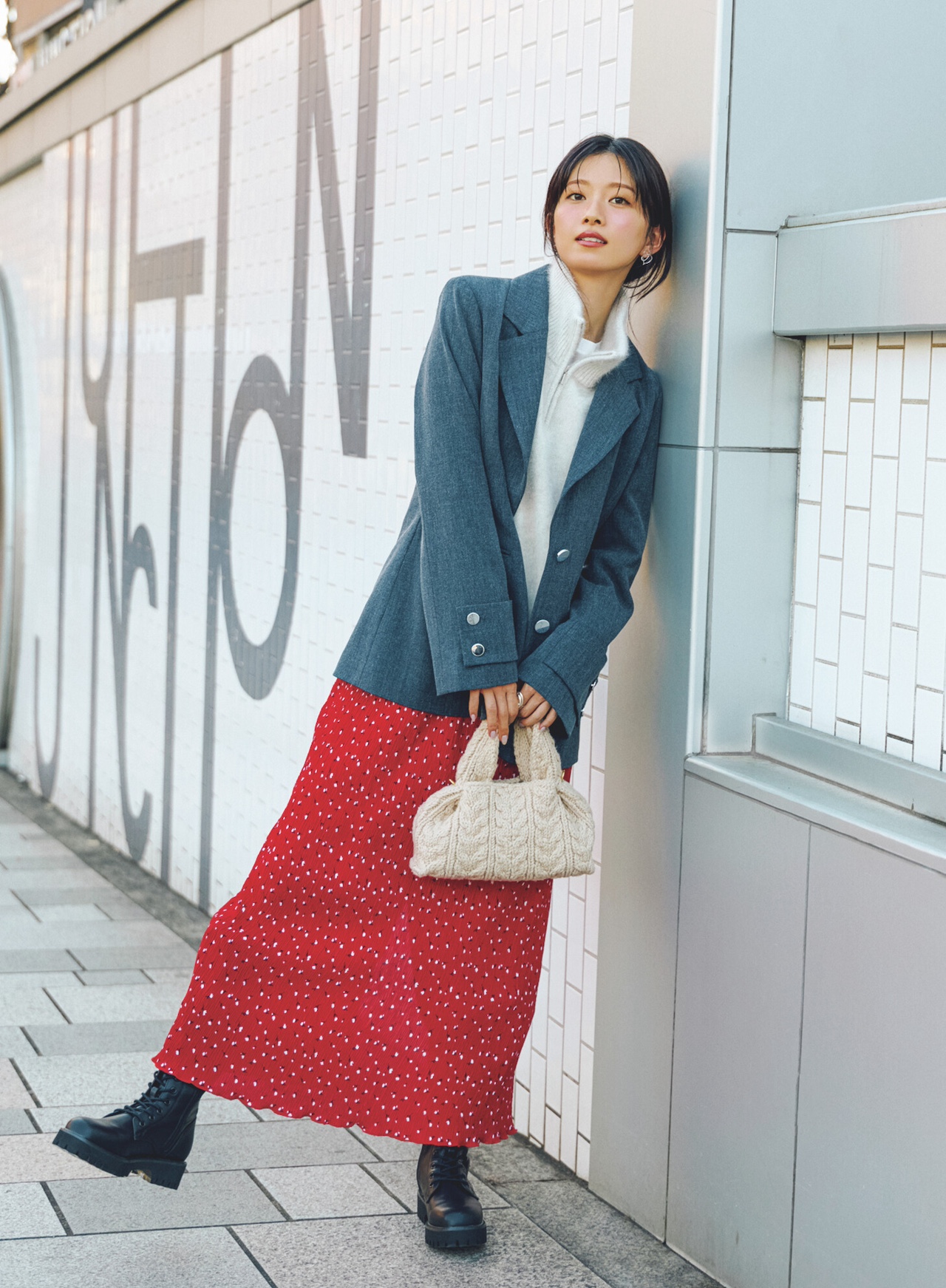 ◾️エレガントな赤にメンズっぽジャケット。ギャップのある甘辛バランスが幸運を呼ぶ!