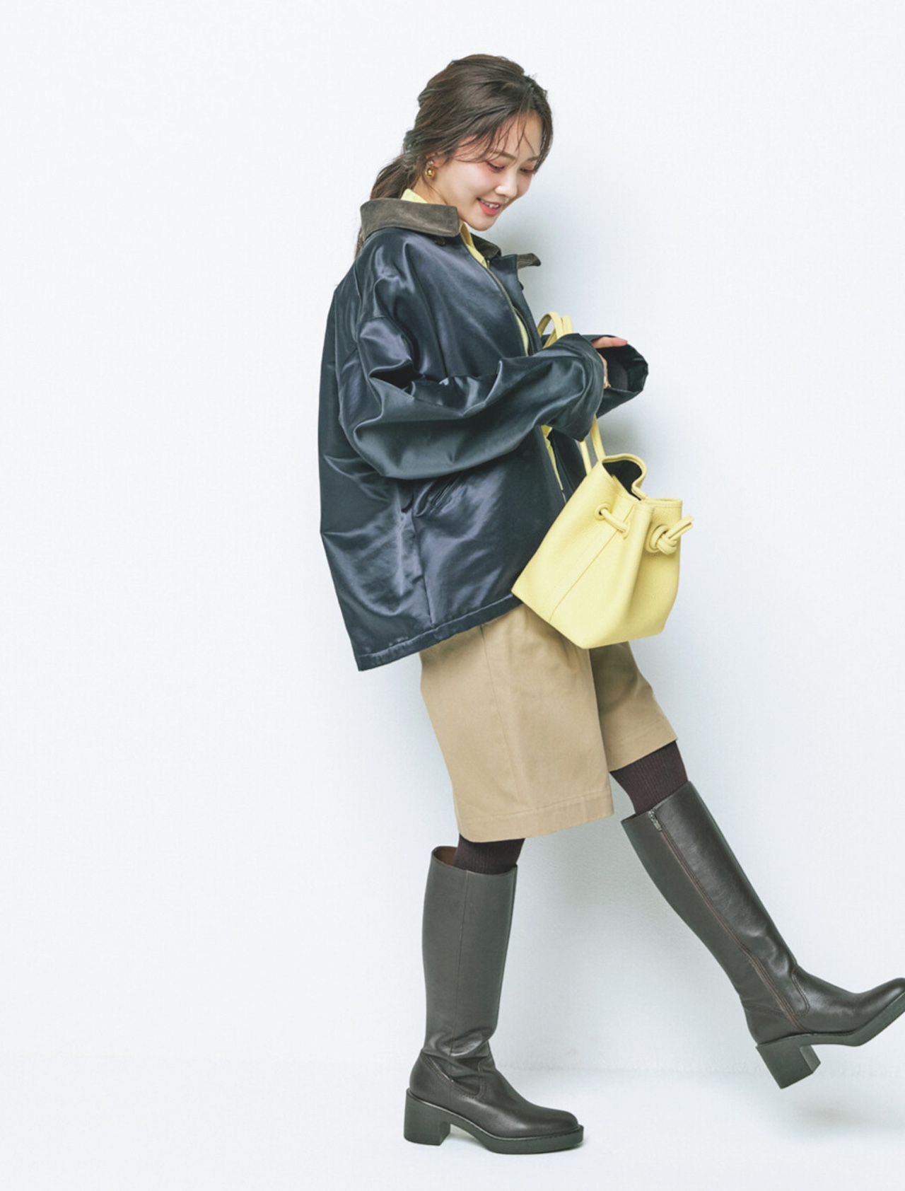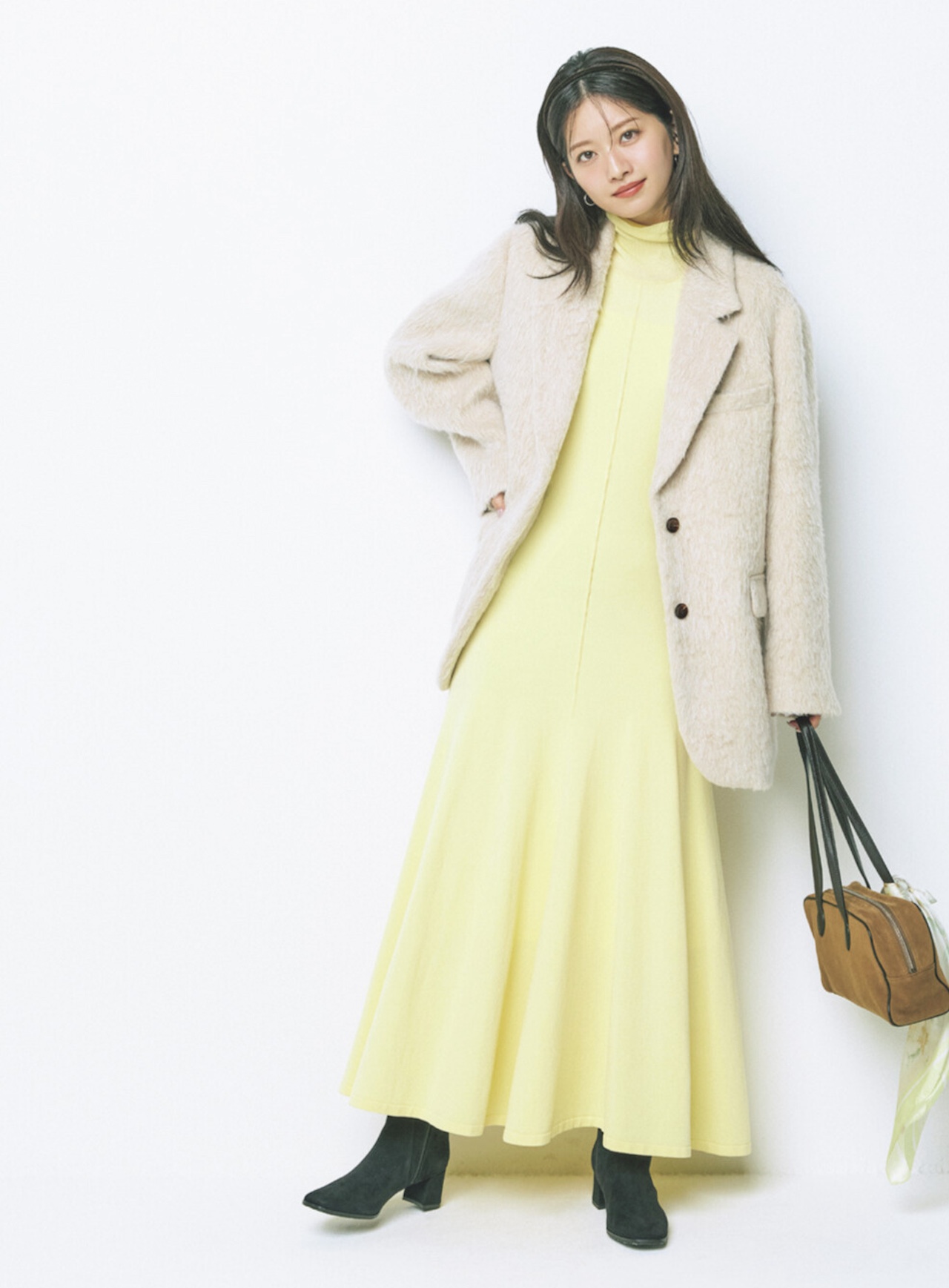 面積の広いワンピースでも着こなしやすい、まろやかなイエロー。さりげにきかせたセンターラインが、のっぺり見えも回避してくれる♪ 淡いベージュのコートを合わせて、きれいめな場所にもマッチするレディなスタイルに。