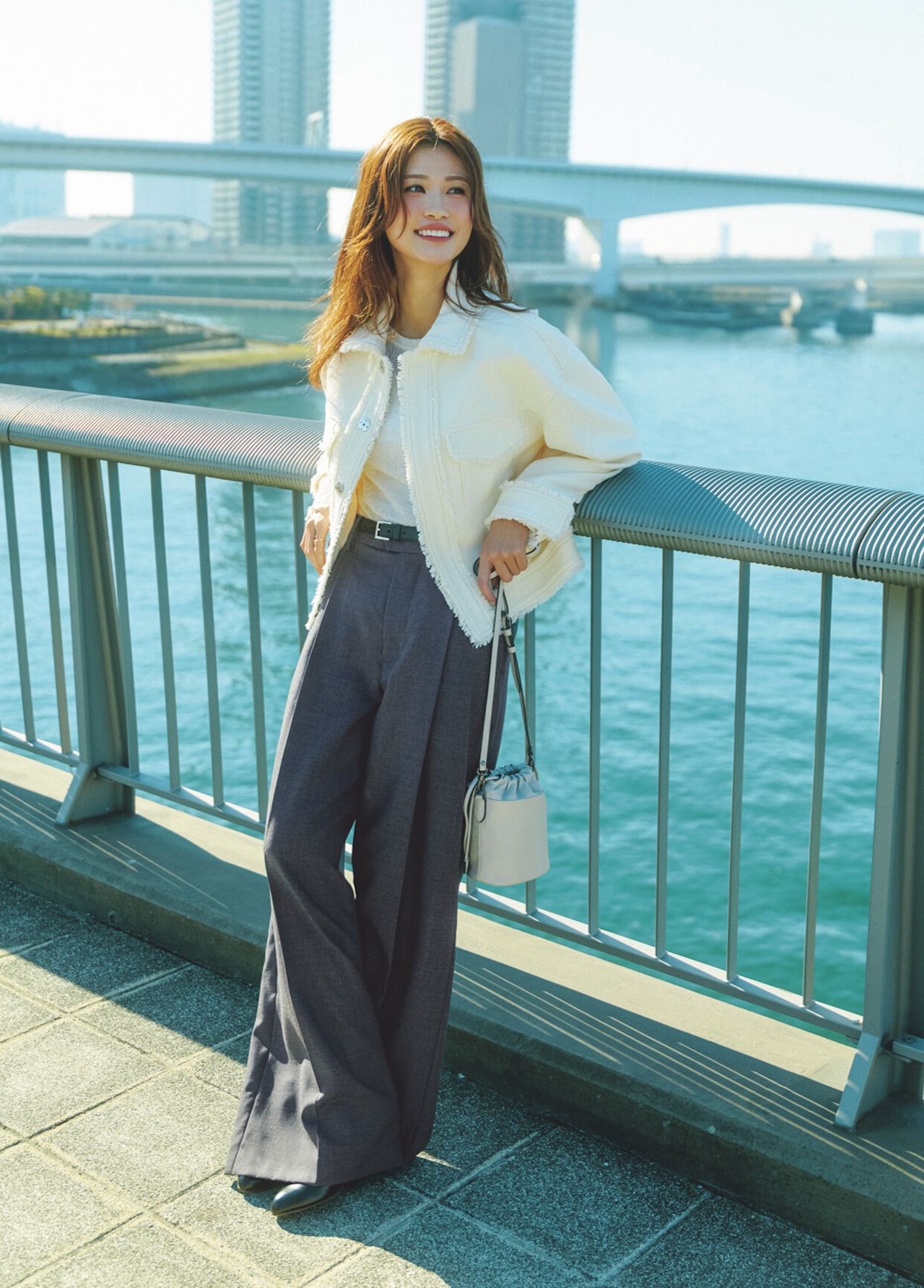上品なツイード素材を、カジュアルなデザインで力の抜けたこなれたムードに。「着ていて心地いい、など無理をしないファッションが白の開運効果を後押し! なんか空回りしてるぞ…ってときはいったん白で冷静になって自分をリラックスさせて」(byここさん)