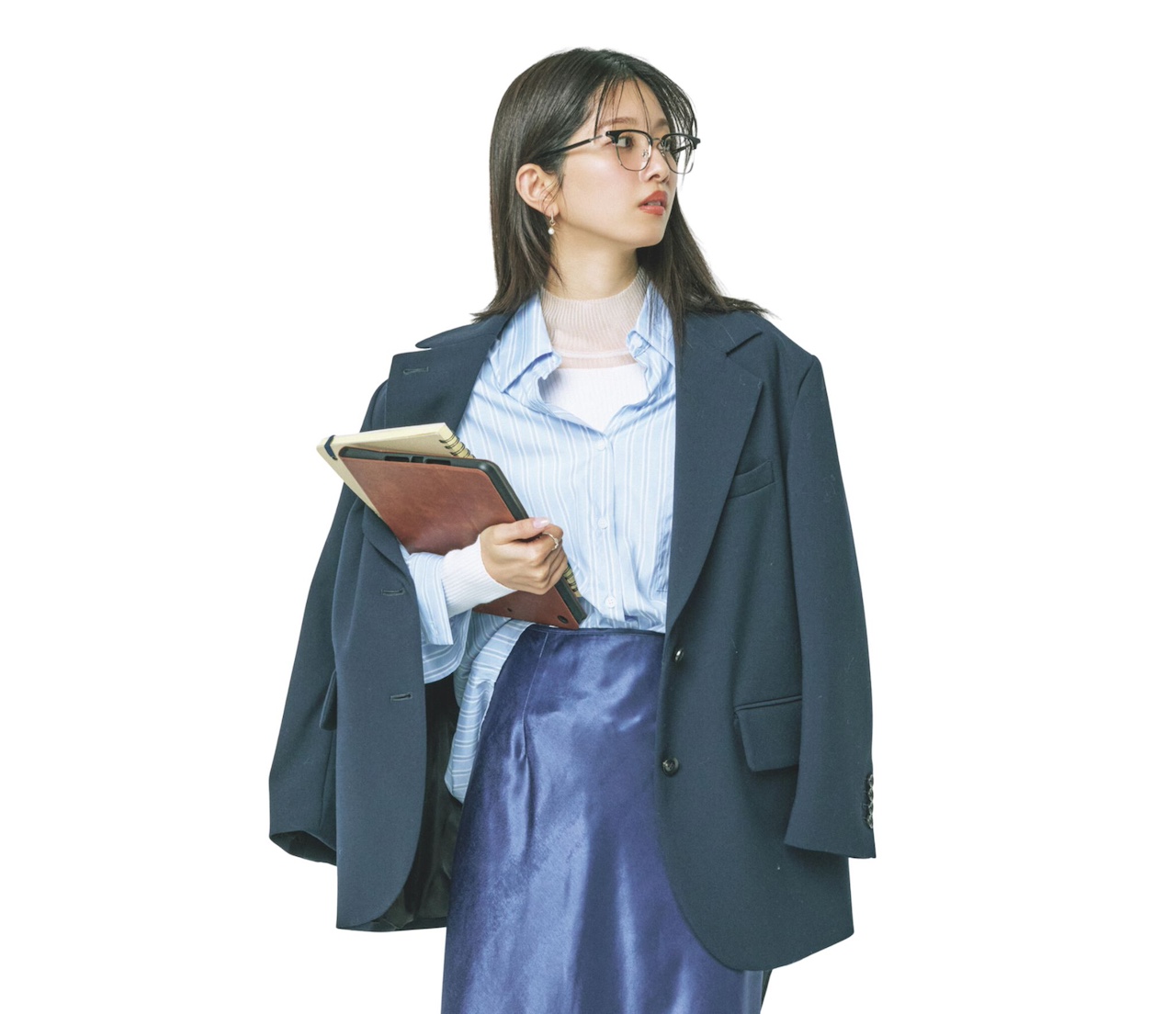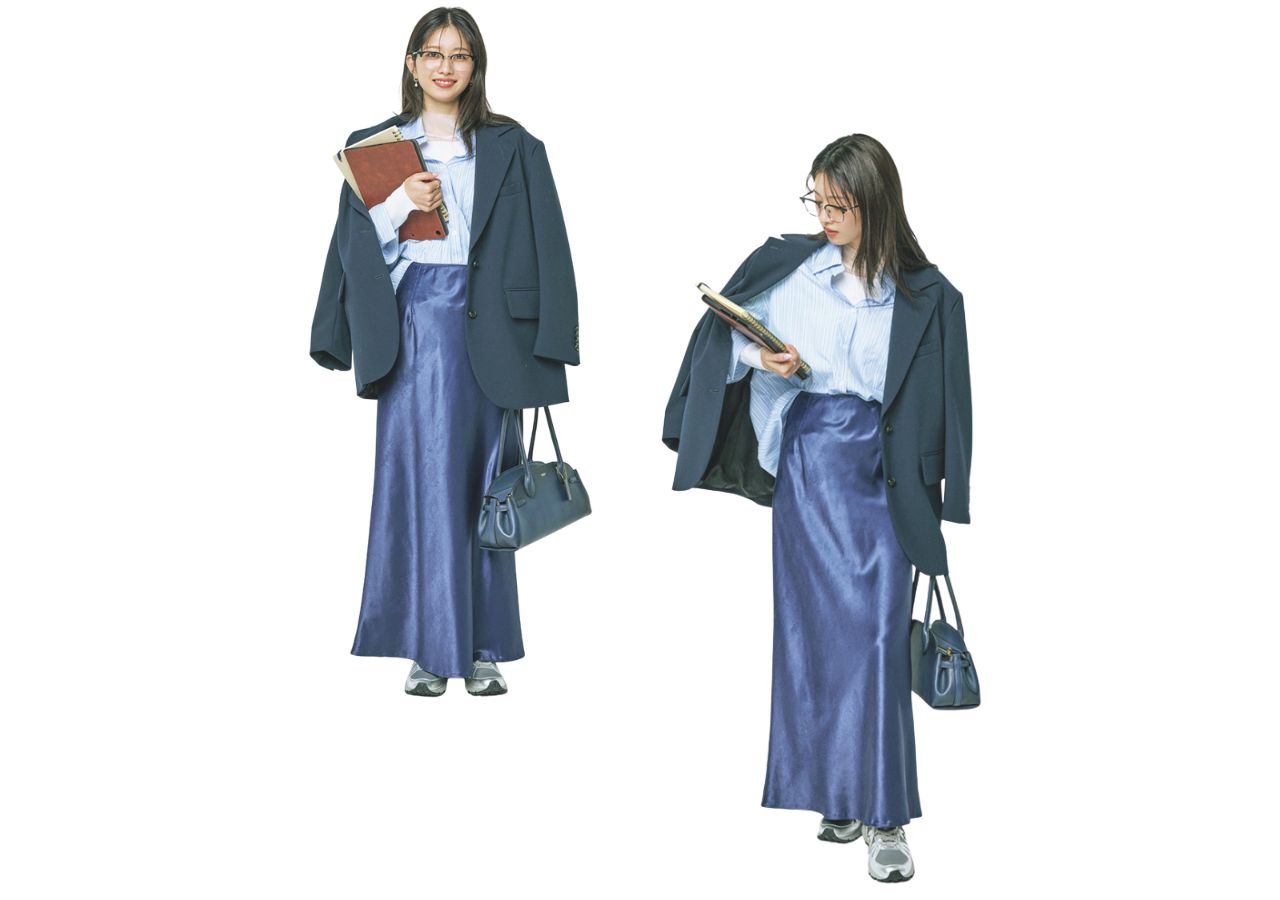 濃度の違う同色を重ねても、知的に仕上がっちゃうのがブルーのいいところ! インナーに白を挟んで抜け感もプラス。背中を押してくれる開運カラーをまとえば、不思議と自信が湧いてくる♪