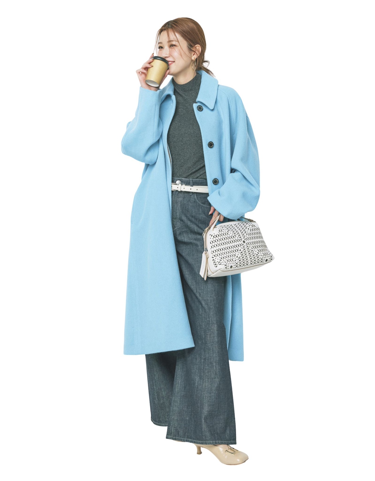 ともすればラフになりすぎてしまうお仕事DAYのデニムスタイルも、鮮やかなブルーのコートと濃紺デニムの洗練グラデのおかげできちんと感◎。好印象に導くクラシカルなデザインも吉!