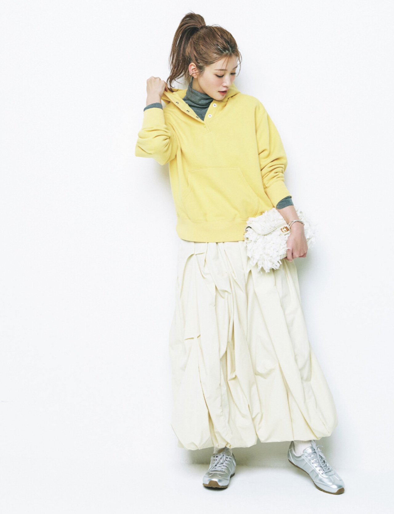 透け感のあるカットソーにシャギーベスト、光沢のあるサテンスカート。異なる素材感を組み合わせて、白一色をリズミカルに♪ 火の性質を持つ丙午ひのえうまの年は、光を集める光沢感のあるスカートも開運アイテム!