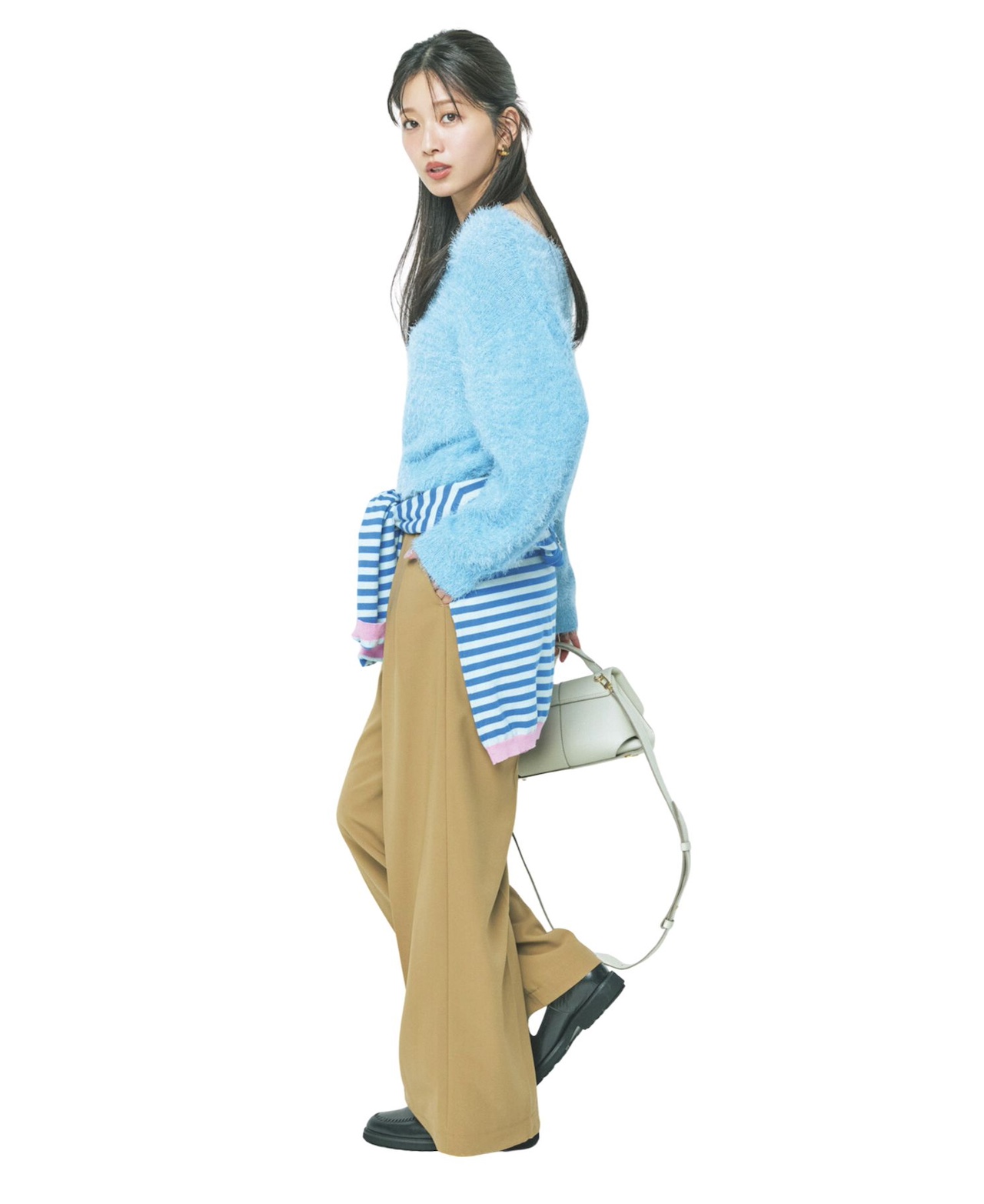 優しく見える淡いブルーのファーニットを凛としたタックパンツでお仕事仕様にシフトして、しごできオーラを放って。腰に巻いたニットにあしらわれたピンクのパイピングも、話しかけやすいムードを作る立役者。
