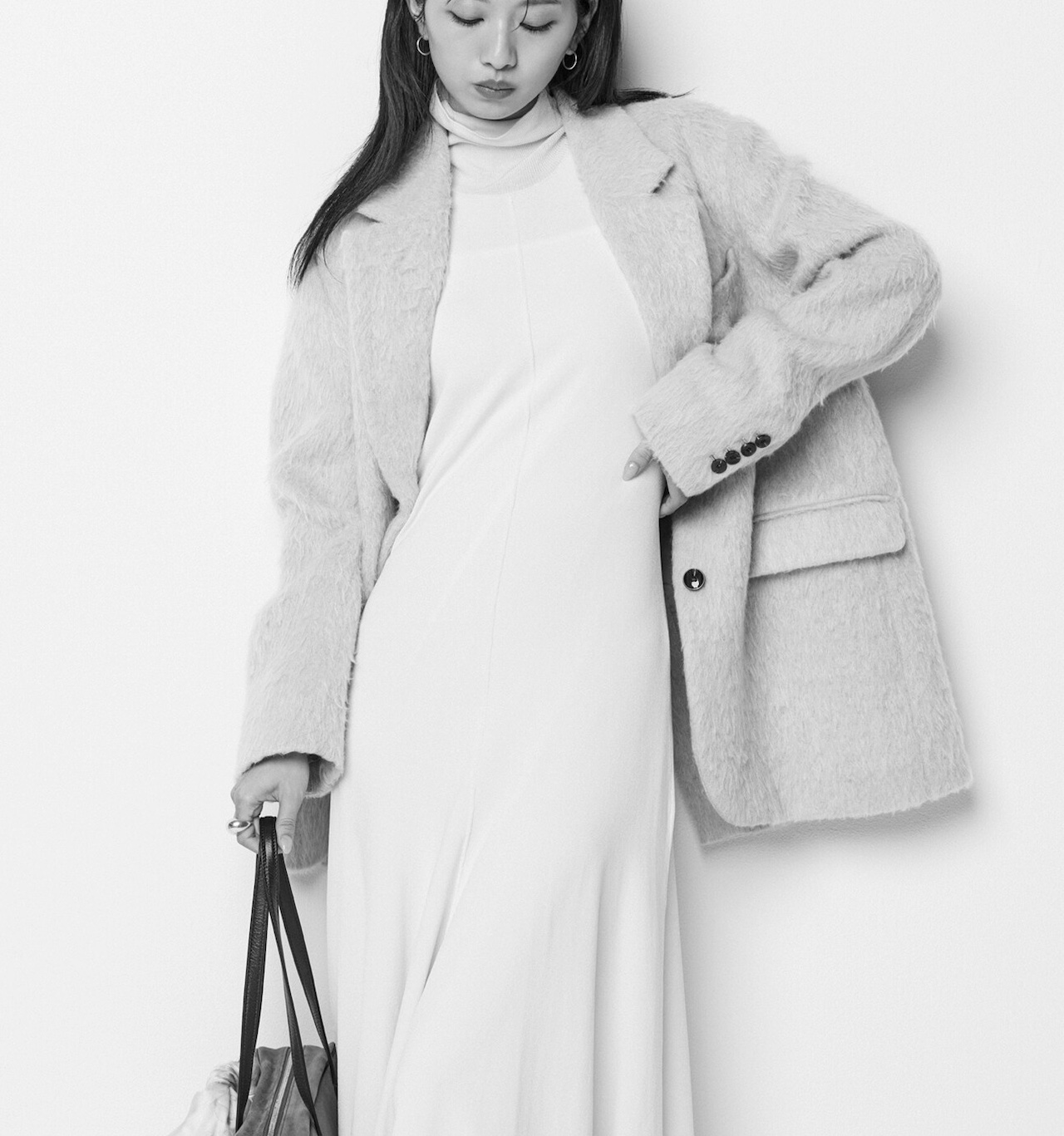 モノトーンコーデにアクセントを加えて、モードな遊び心を。