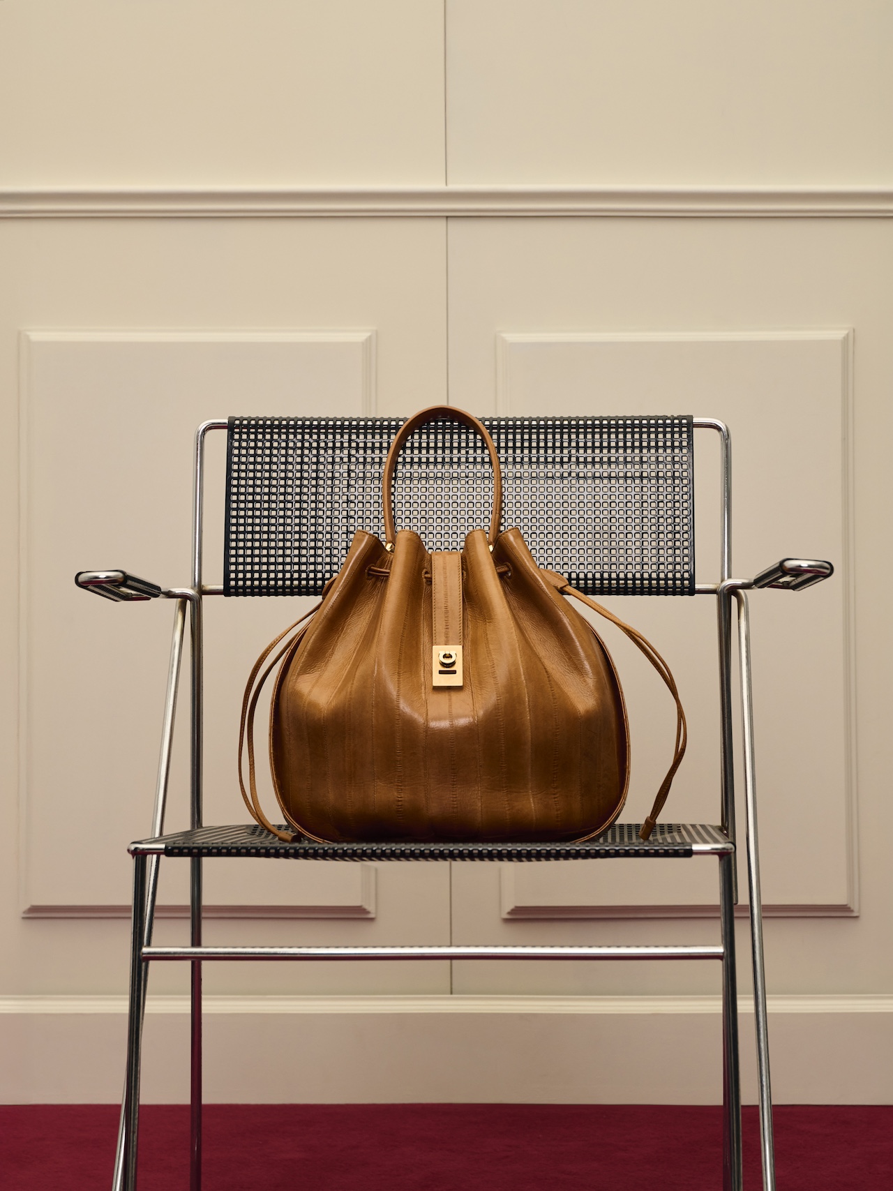 メンズセレクションでも、アイコンバッグ「Hugバッグ」が登場。ナチュラルなタンレザー、ブラックのペブルドカーフ、そしてスエードパネルに縦方向の編み込みレザーバンドを配したあたたかみのあるダークブラウンの3種。