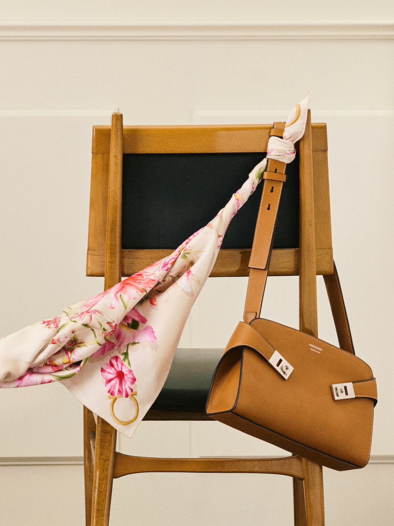 シルクスカーフは2型登場。1つ目は、ブランドの歴史あるフィレンツェ本社のパラッツォ・スピーニ・フェローニをモチーフに、何百枚もの色彩鮮やかな花びらを並べて描く、フェラガモを象徴する「ペタル技法」によって表現されたプリント。