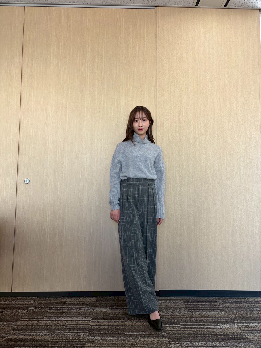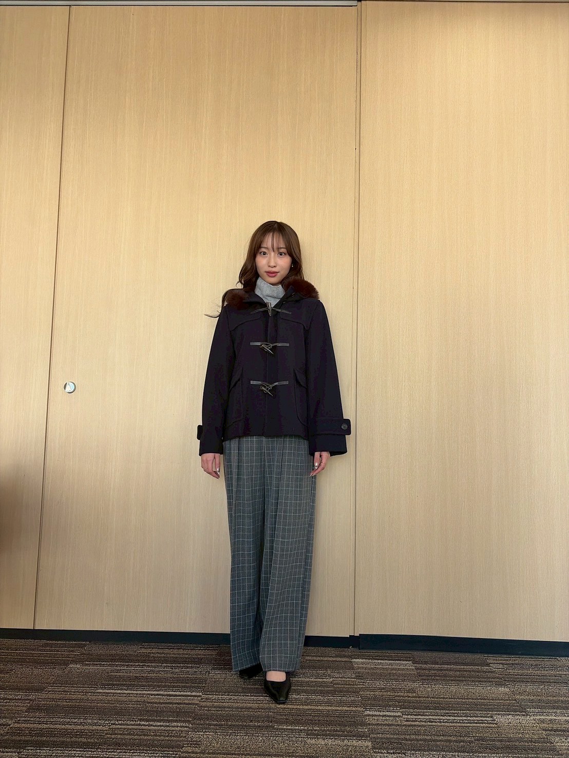 ■2/5(木)/ネイビーショートダッフルコート×チェックワイドパンツ