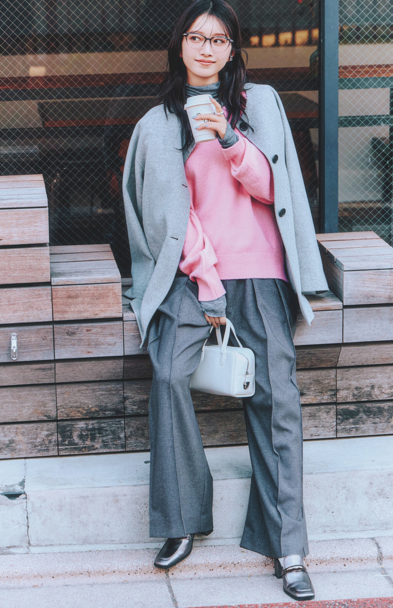 コート¥53,900(アンタイトル)、カットソー¥9,900(aeka corporation<louren>)、パンツ¥32,500(シーニュ)、バッグ¥31,900(TOUT Y EST)、靴¥19,800(銀座かねまつ6丁目本店<銀座かねまつ>)、靴下¥1,210(タビオ<靴下屋>)、メガネ¥23,100(デリーゴジャパン<フルラ>)、イヤカフ¥2,970(フィービィー)、リング¥19,800(ココシュニック<ココシュニック オンキッチュ>)、ニット/着回し
