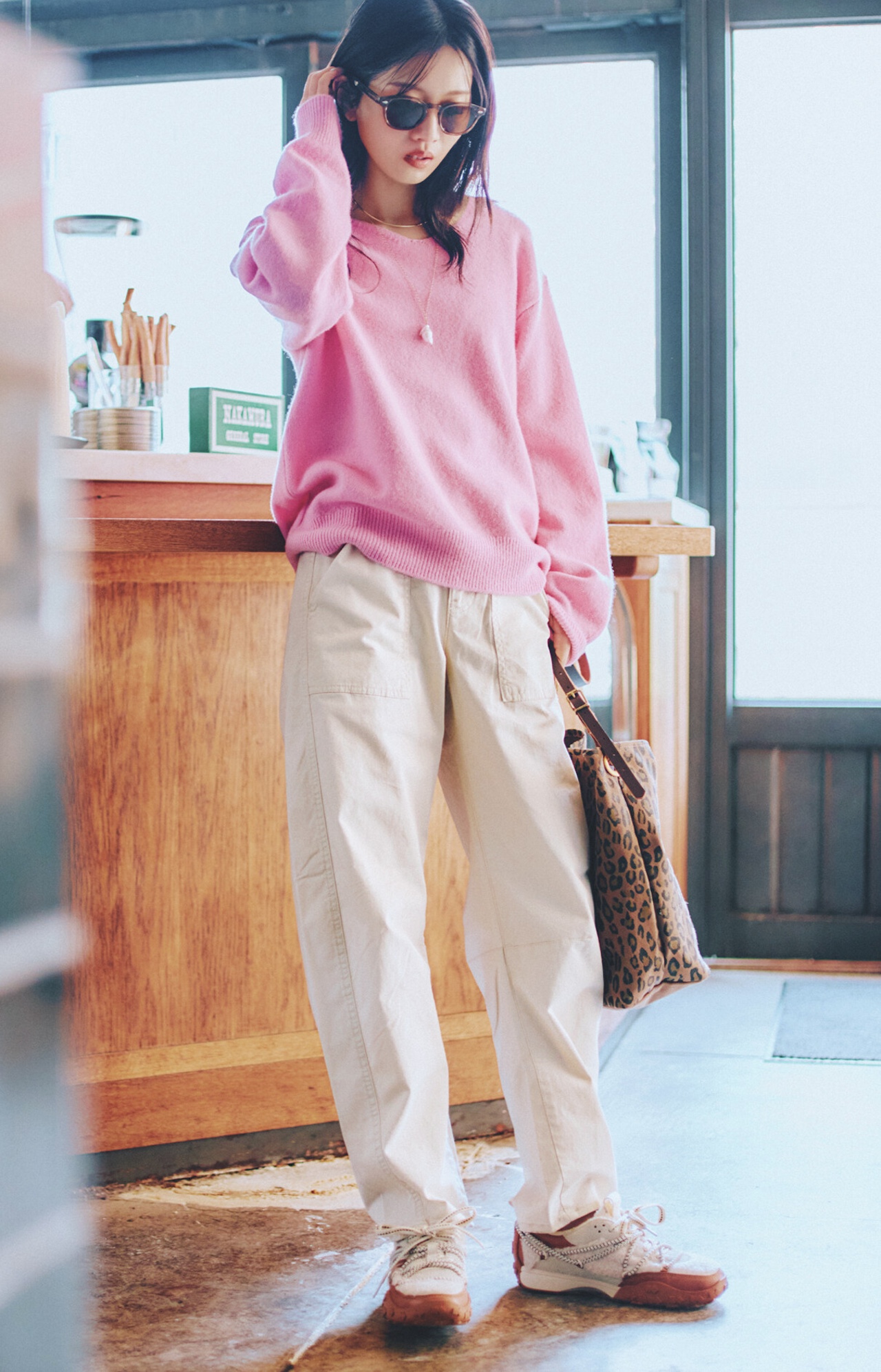 パンツ¥7,990(Gap)、バッグ¥17,600(ゲストリスト<ルミノア>)、靴¥48,400(ケイト・スペード<ケイト・スペード ニューヨーク>)、サングラス¥52,800(モスコット アオヤマ<モスコット>)、チョーカー¥15,400(ココシュニック<ココシュニック オンキッチュ>)、ネックレス¥14,000(gemma alus<ALUS>)、ニット/着回し